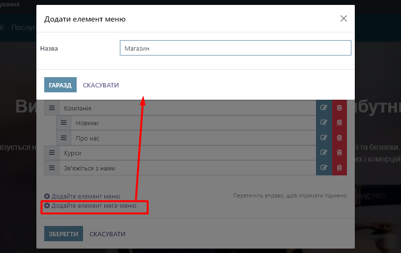 Для створення мега-меню натисніть кнопку «Додайте елемент мега-меню»: