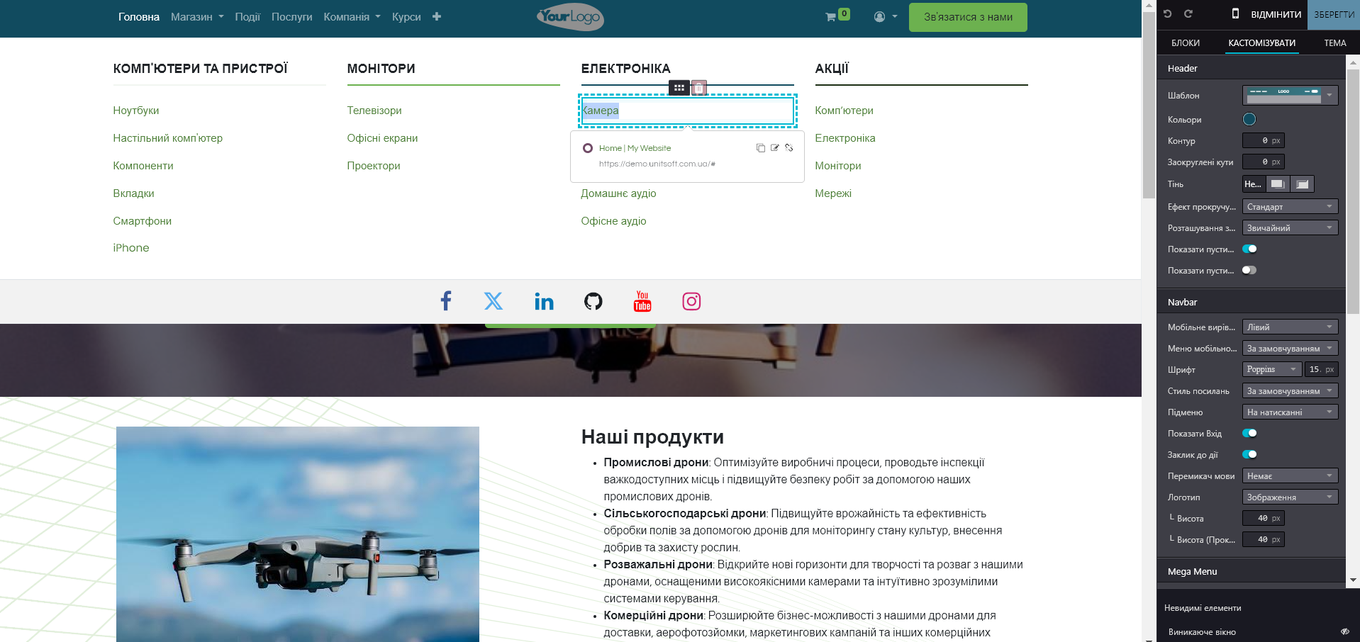 Мега-меню складається з окремих блоків, які можна змінювати: