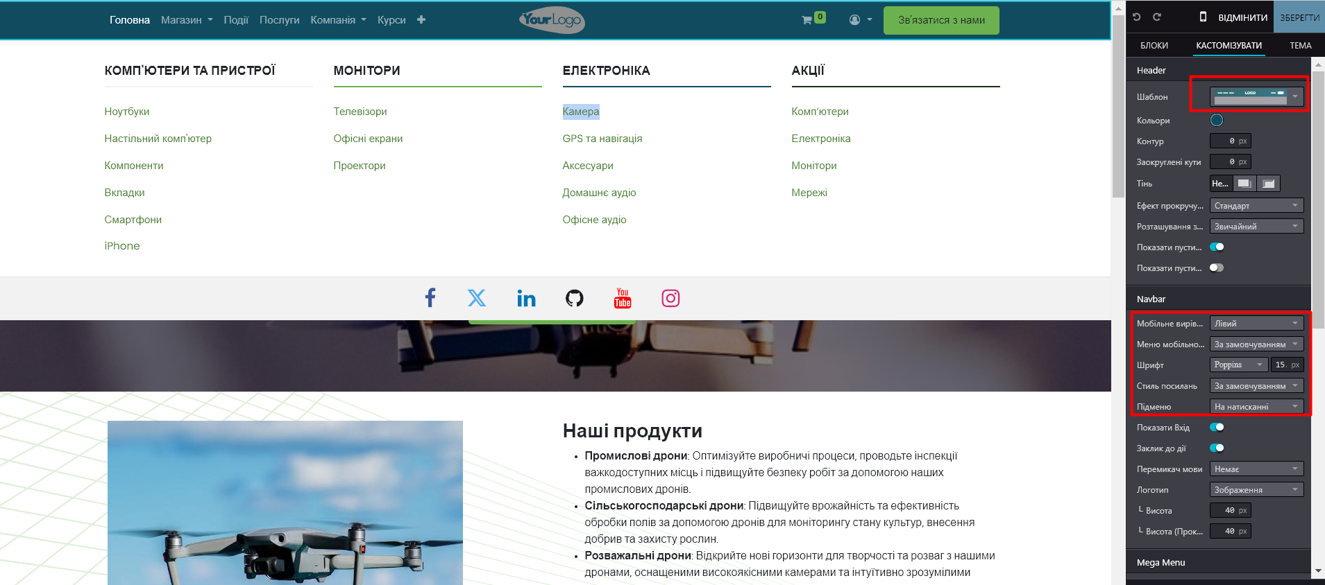Щоб змінити загальний макет мега-меню, можна вибрати відповідний шаблон, колір, розмір, шрифт і т.д. у вікні редактора веб-сайту.
