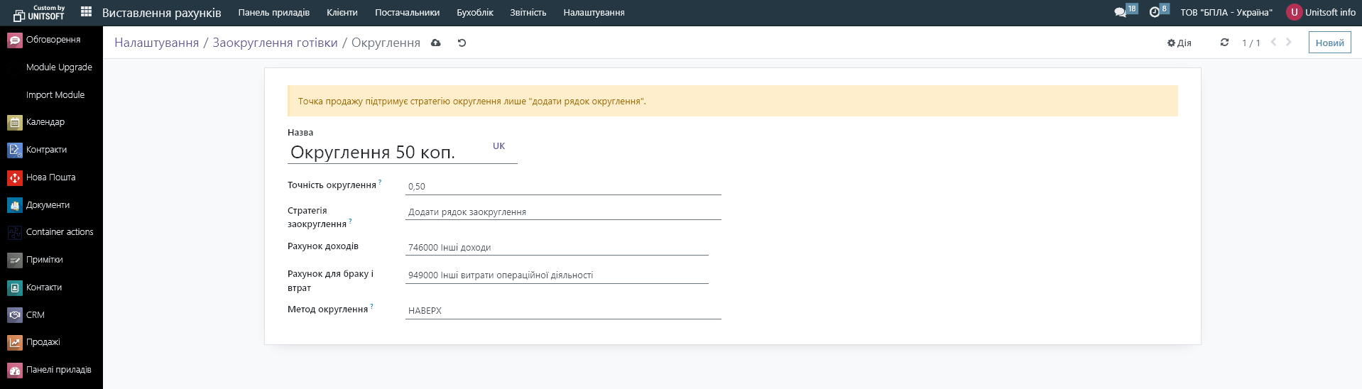 В налаштуваннях вказуємо точність округлення, спосіб округлення та рахунок доходів та витрат на які списуватиметься різниця: