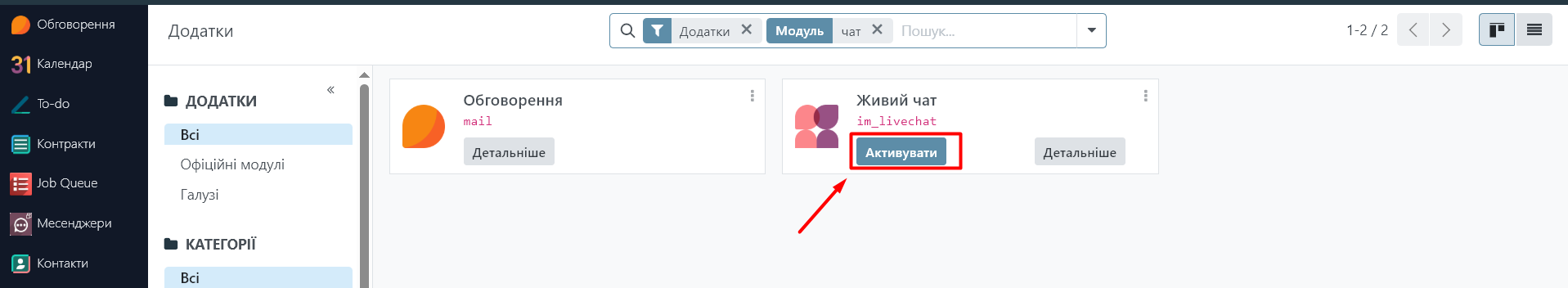 Натисніть на кнопку «Активувати» для модуля "Живий чат".