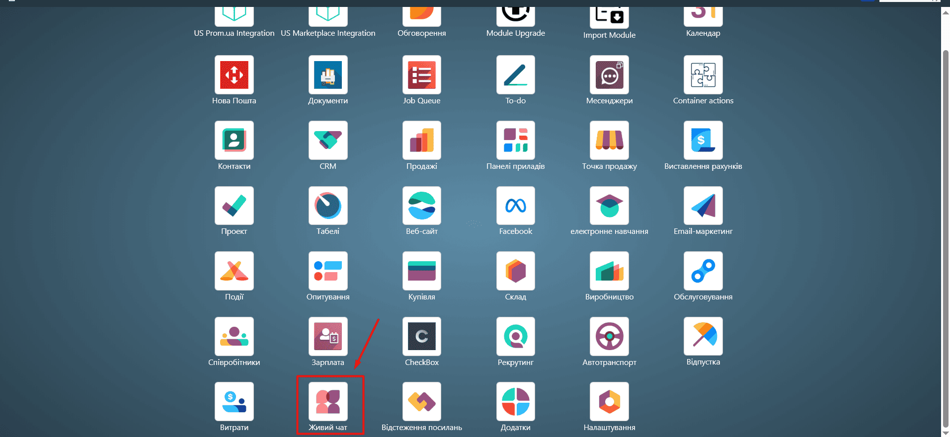 Перейдіть модуль «Живий чат» у головному меню Odoo: