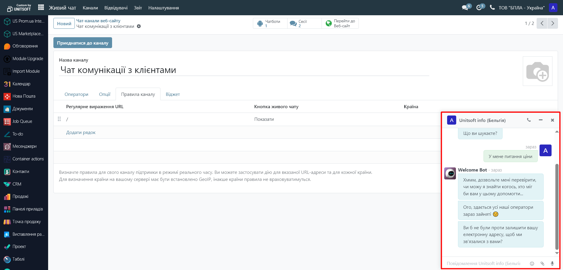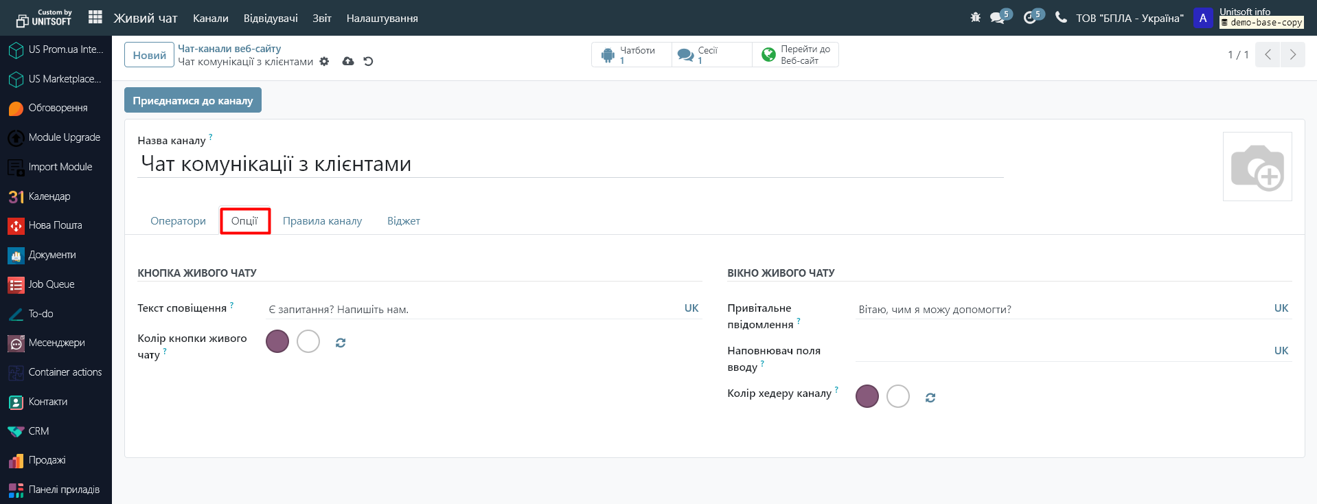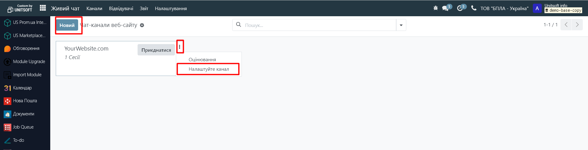 Тут Ви можемо створити новий живий чат через кнопку «Новий», або ж налаштувати існуючий, використовуючи меню «Налаштуйте канал»:
