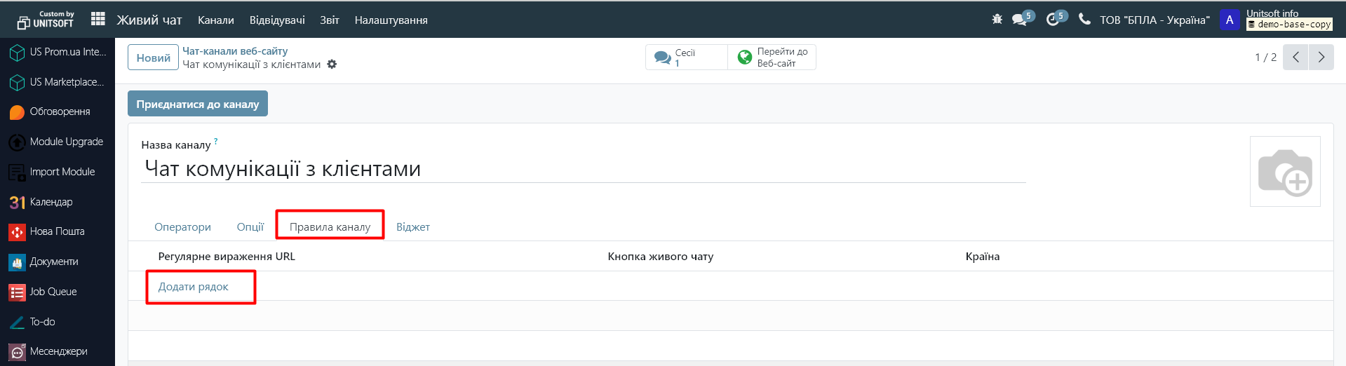 Далі налаштуйте особливості відображення чату на сайті. Для цього у вкладці «Правила каналу» натисніть «Додати рядок»: