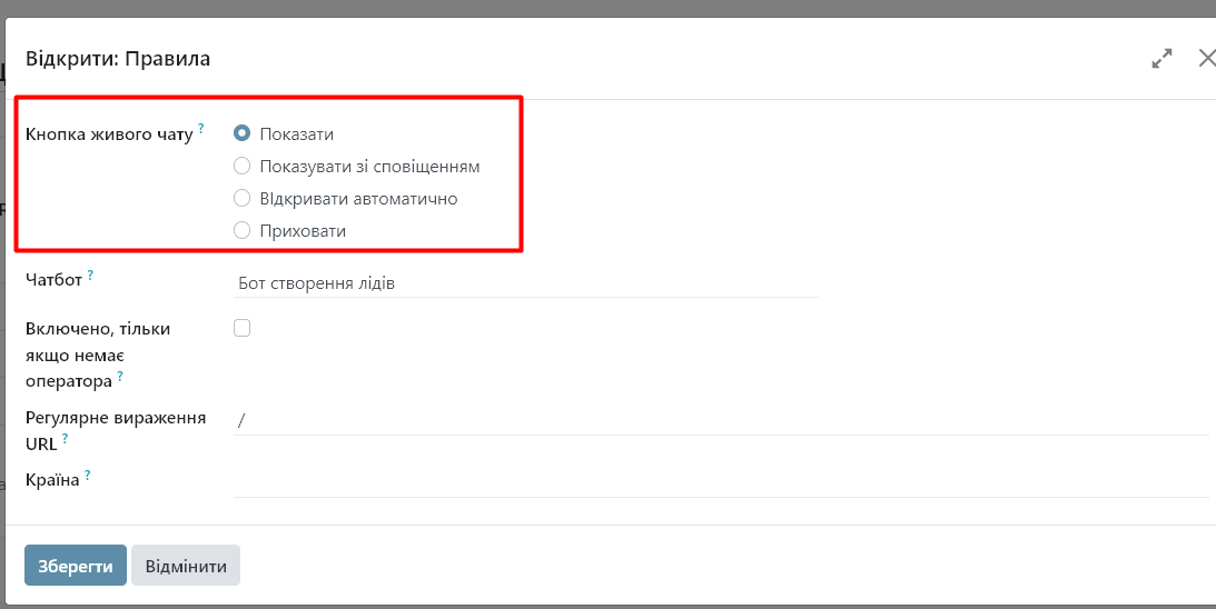 • Показати: відображає кнопку чату на сторінці.