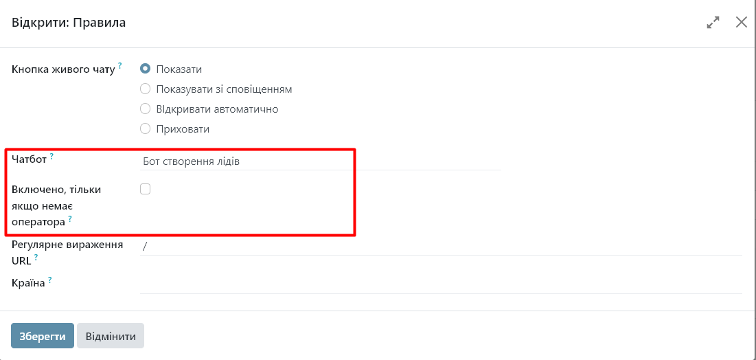 Щоб додати чат-бота до каналу, виберіть його з випадаючого меню. Якщо чат-бот має працювати тільки тоді, коли жоден оператор не доступний, поставте галочку поруч із полем «Включено, тільки якщо немає оператора».