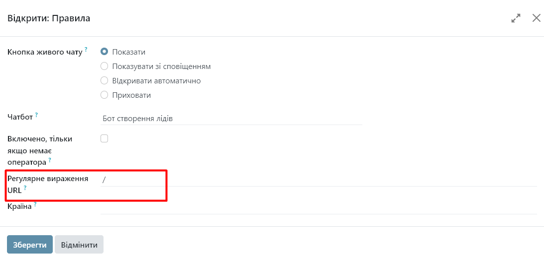 У полі «Регулярне вираження URL» введіть відносну URL-адресу сторінки, де повинна з'являтися кнопка чату. Наприклад, щоб застосувати правило до URL https://mydatabase.odoo.com/shop, введіть /shop у поле «Регулярне вираження URL».