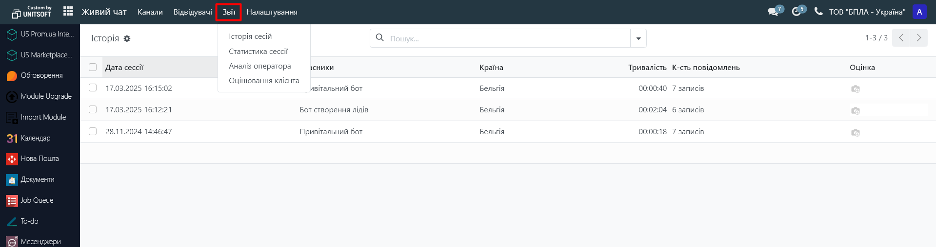 Для аналізу роботи операторів, в модулі «Живий чат» перейдіть у меню «Звіт». Тут ви зможете побачити історію переписок, статистику та оцінку відвідувачів сайту щодо якості консультацій: