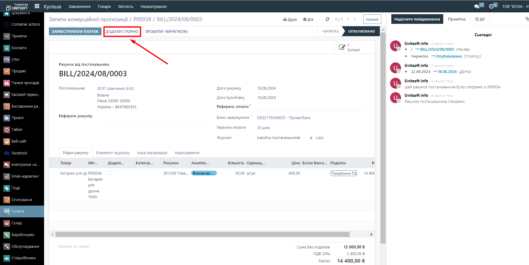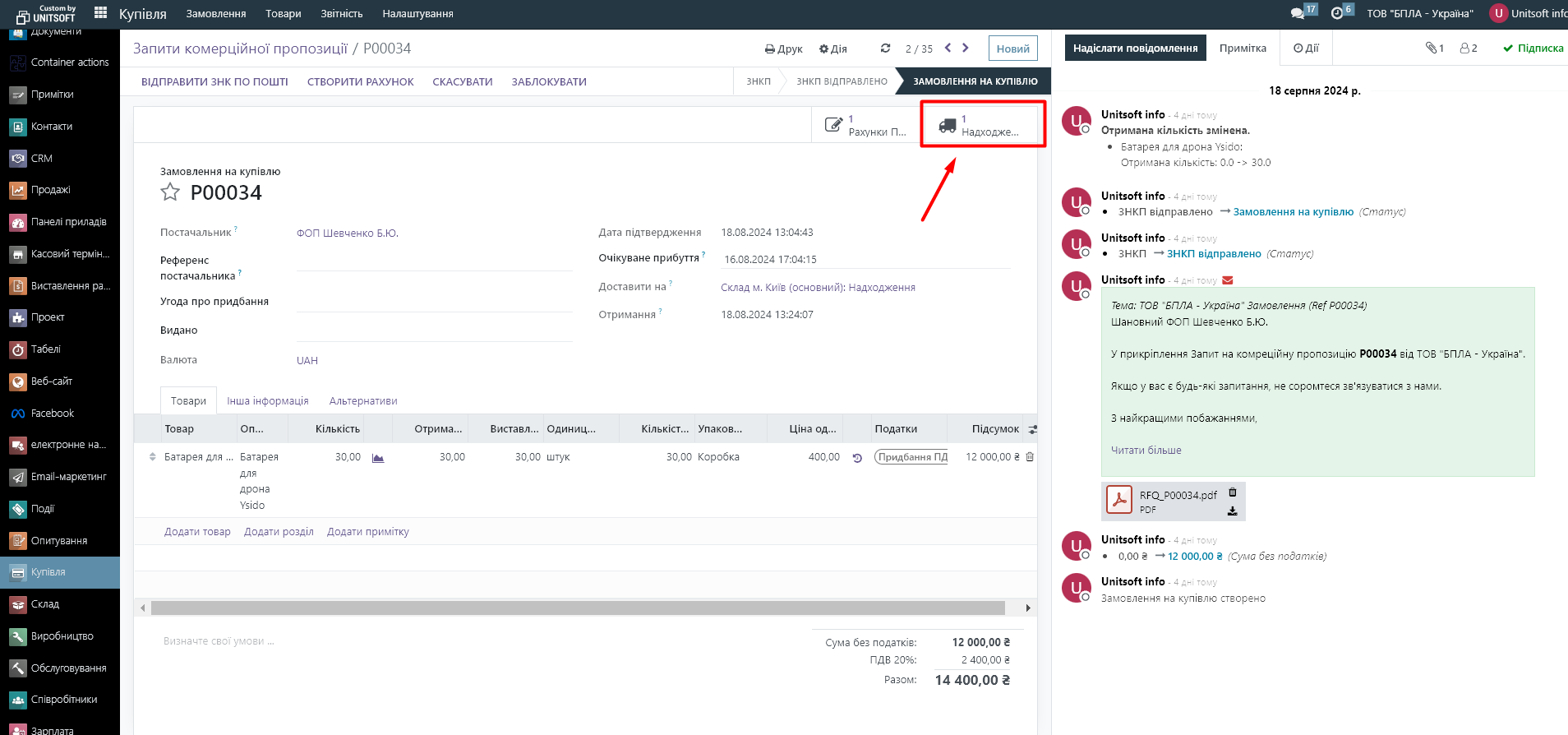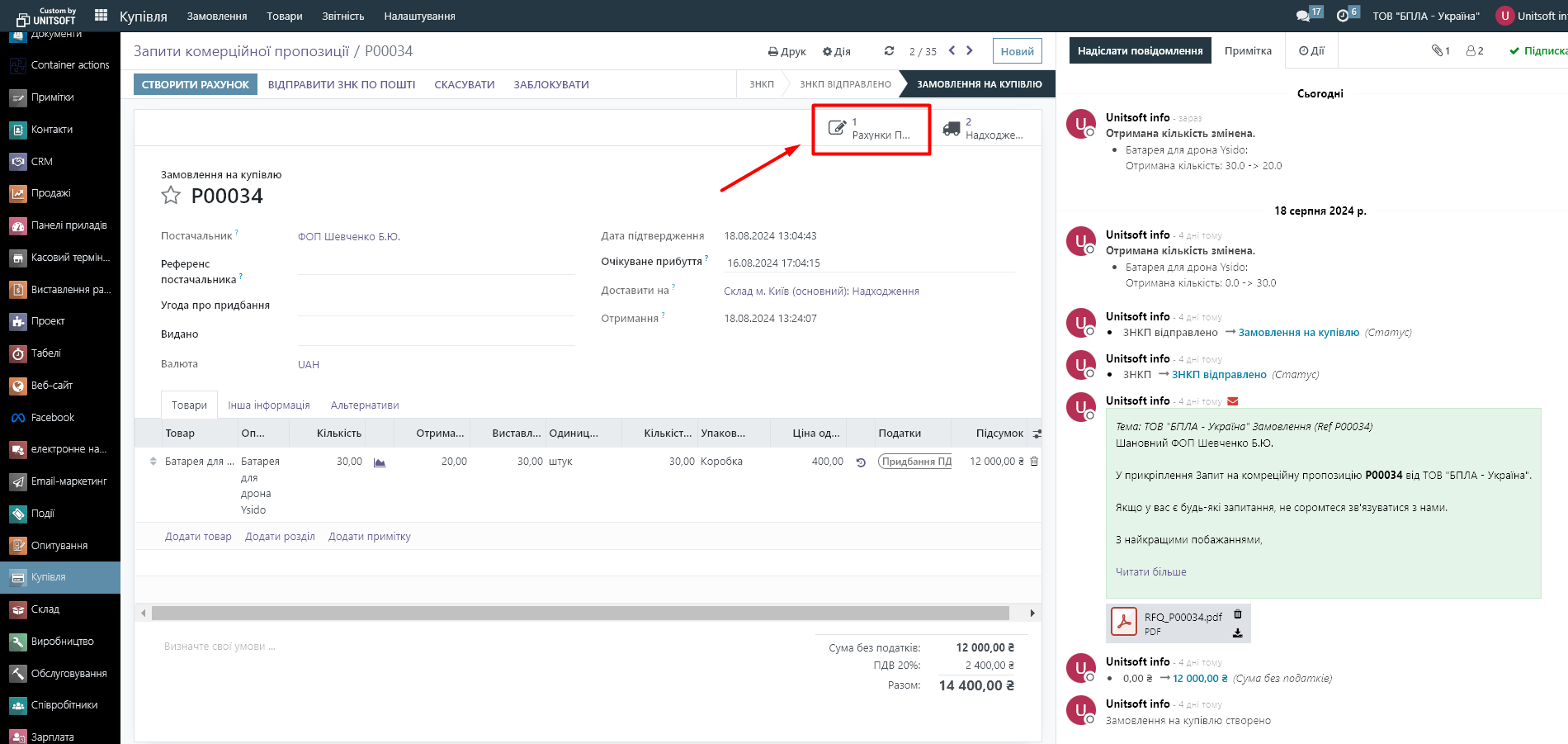Повертаємося в Запит комерційної пропозиції або Замовлення н по якому відбувалася купівля товару. Переходимо в документ Рахунки постачальника (інвойси постачальника):