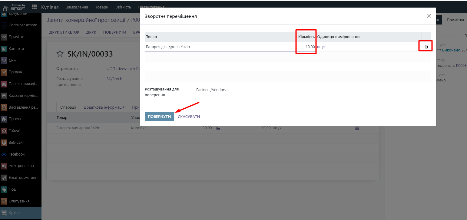 Видаляємо зайві рядки (якщо вони є) та вказуємо кількість товару, яку хочемо повернути, натискаємо «Повернути»: