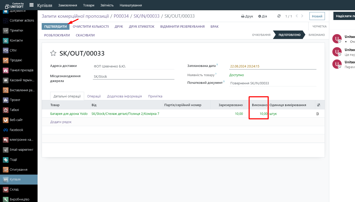 Після цього створиться документ складського переміщення. Встановлюємо кількість повернутого товару та натискаємо «Підтвердити»: