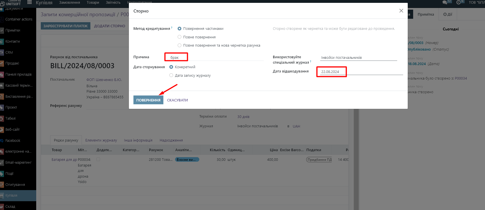 Вказуємо причину повернення та дату створення кредит-ноти. Натискаємо “Повернення”: