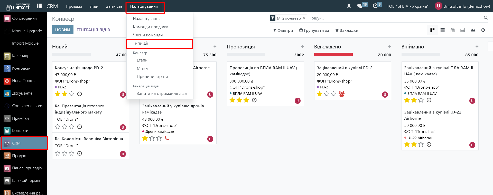 Для цього перейдіть в модуль «CRM» - меню «Налаштування» - «Типи дії»: