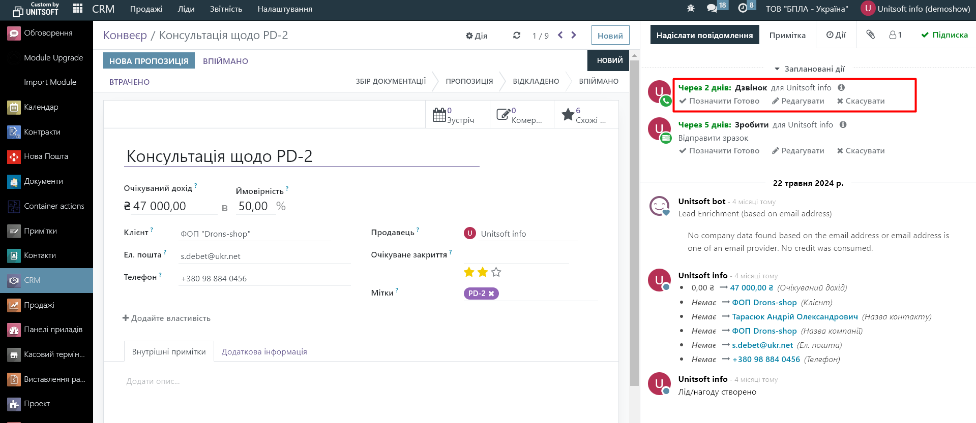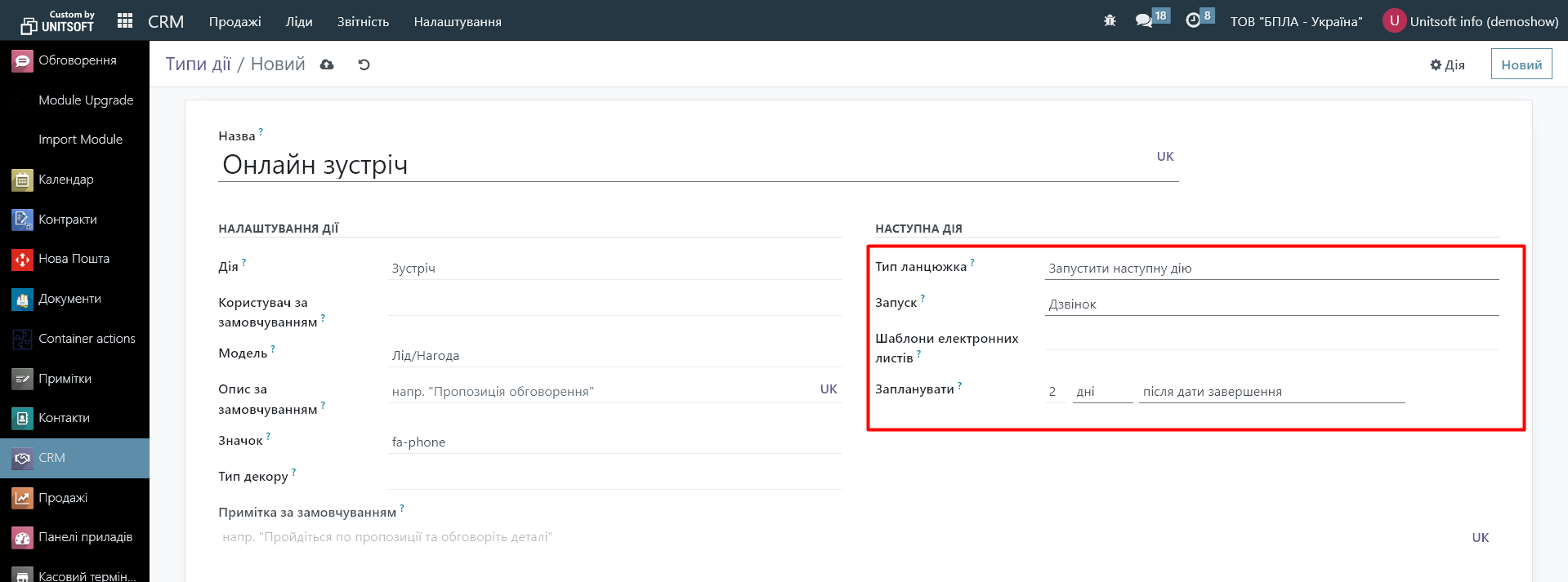 Якщо після поточної дії потрібно автоматично планувати наступну, це можна зробити в розділі «Наступна дія». Наприклад, ви хочете запланувати телефонний дзвінок через два дні після онлайн-зустрічі. Для цього в полі «Тип ланцюжка» виберіть, чи система повинна автоматично запланувати наступну дію або лише запропонувати її. У полі «Запропонувати» вкажіть дію «Дзвінок» і налаштуйте правила для визначення дедлайну дзвінка.