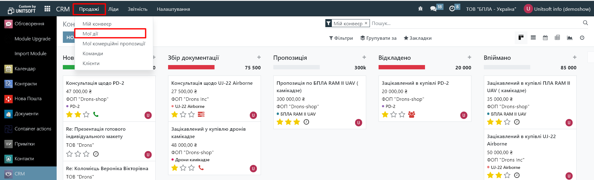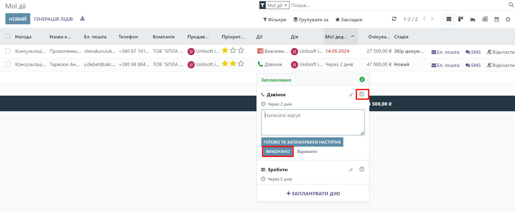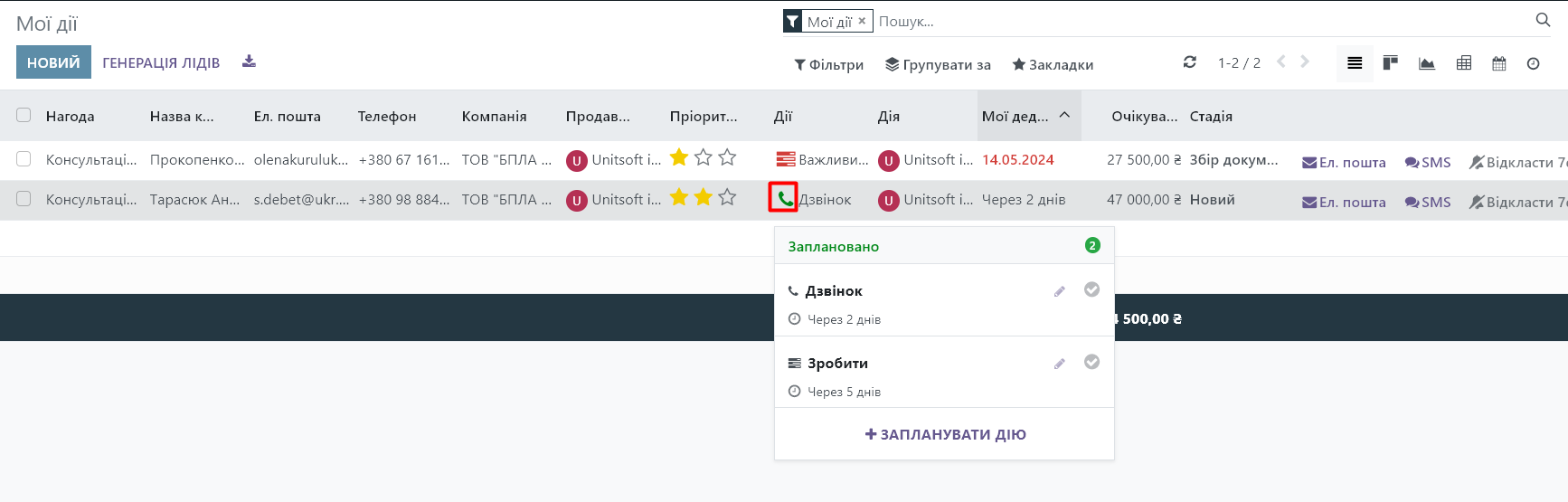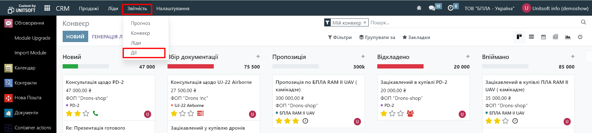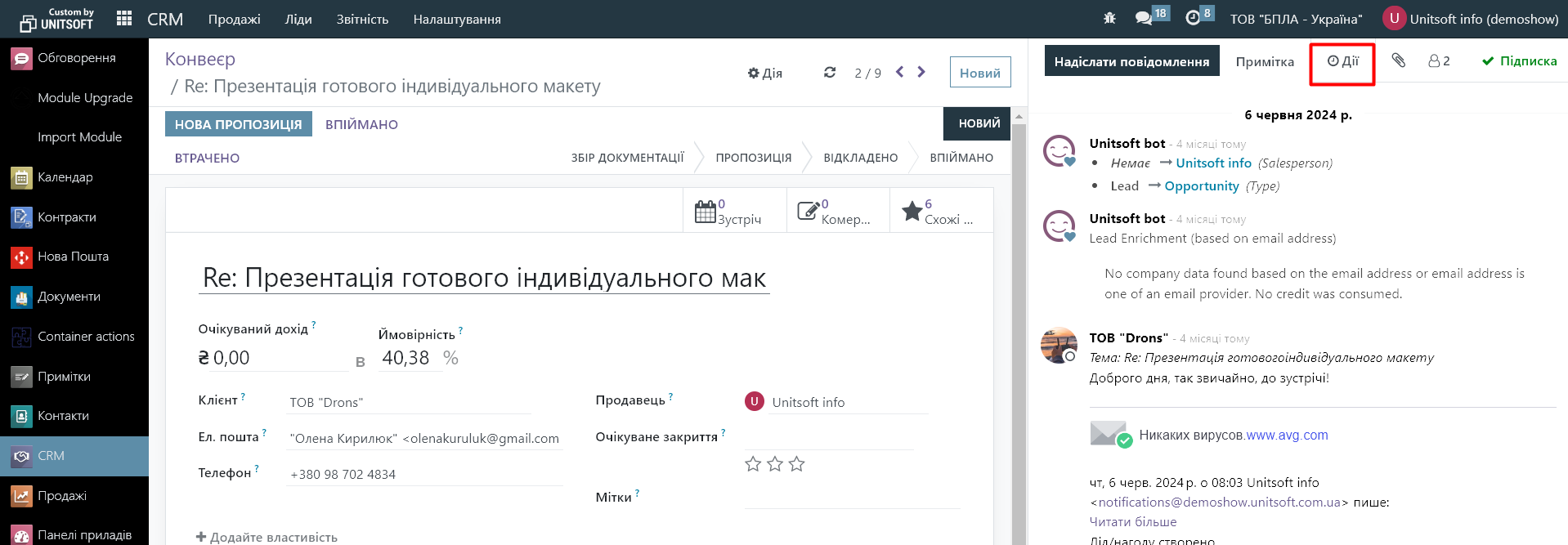 Для планування дії, перейдіть в картку нагоди (ліда) та натисніть кнопку «Дії»: