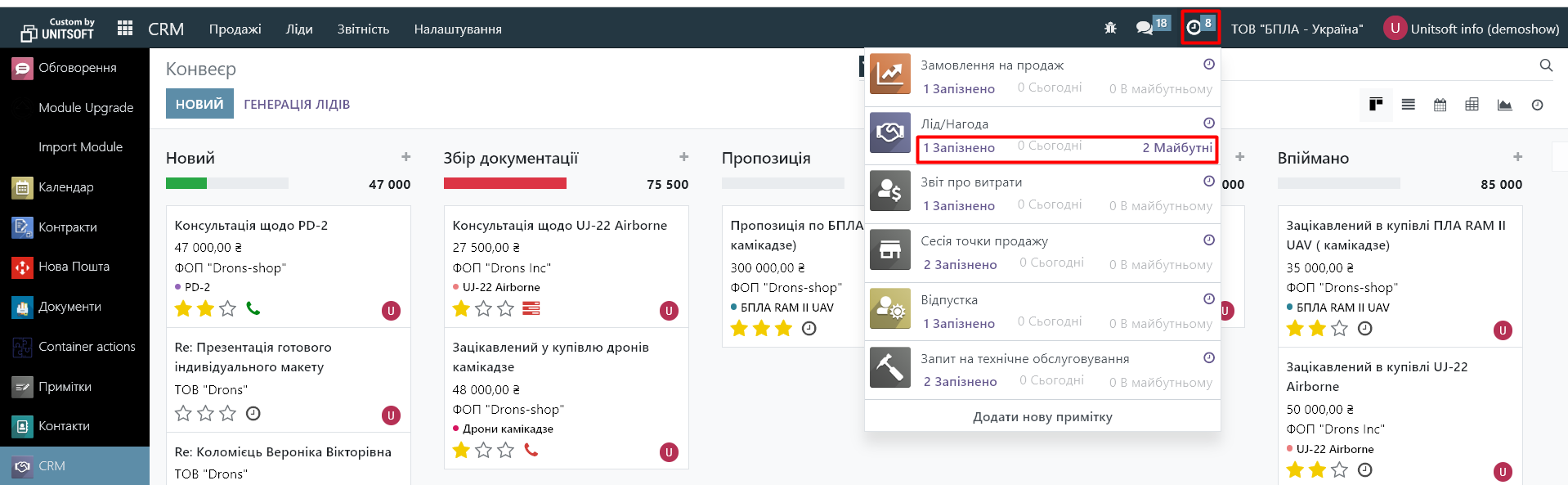 В верхній панелі натисніть на піктограму годинника. Тут Вам відобразиться інформація про кількість запланованих дії та їх статус. Натиснувши на посилання, наприклад, «1 запізнено» Ви потрапите в панель «Мої дії» та побачите детальнішу інформацію про протерміновану дію