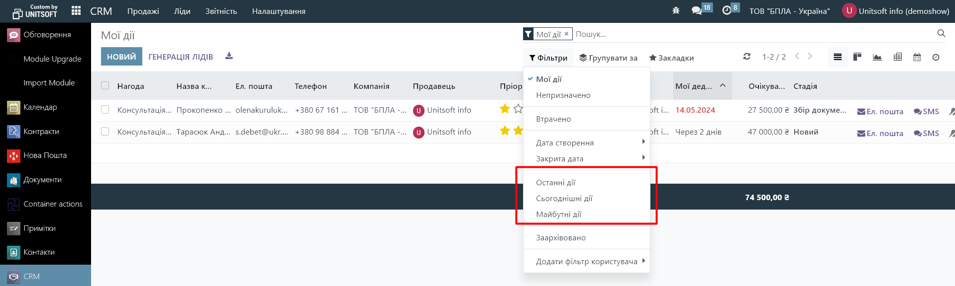 Odoo CRM – це потужний інструмент для управління взаємодією з клієнтами. Однією з ключових функцій є система дій (активностей), яка допомагає користувачам виконувати різні задачі та організовувати робочі процеси. Завдяки діям, ви можете планувати дзвінки, зустрічі, надсилати електронні листи та багато іншого, забезпечуючи кращу комунікацію з клієнтами та ефективніше управління вашими завданнями.