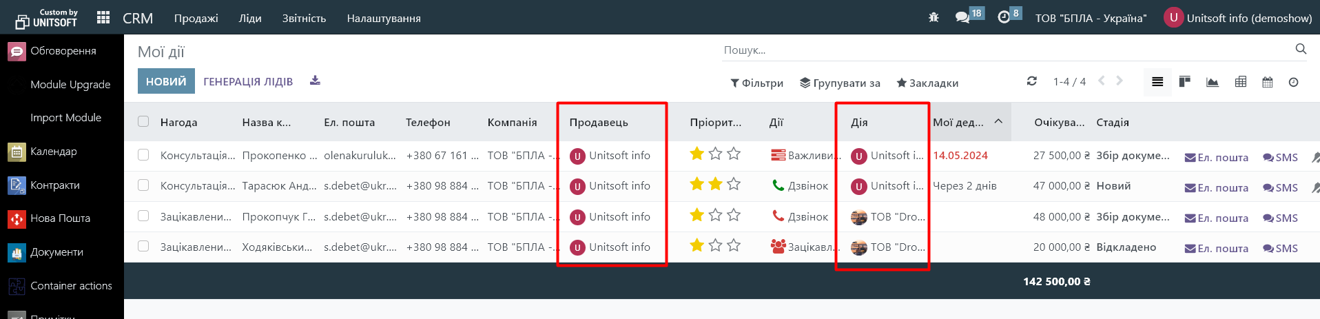 В колонці «Продавець» він зможе побачити хто вказаний менеджером в картці нагоди, по якій запланована дія. В колонці «Дія» - хто є безпосереднім виконавцем запланованої дії: