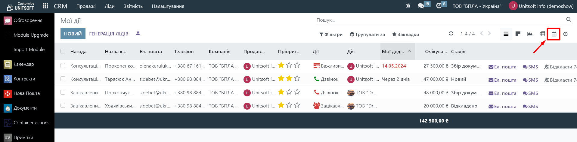 При необхідності заплановані дії можна буде переглянути у вигляді календаря, для цього переключить тип перегляду в правому куті: