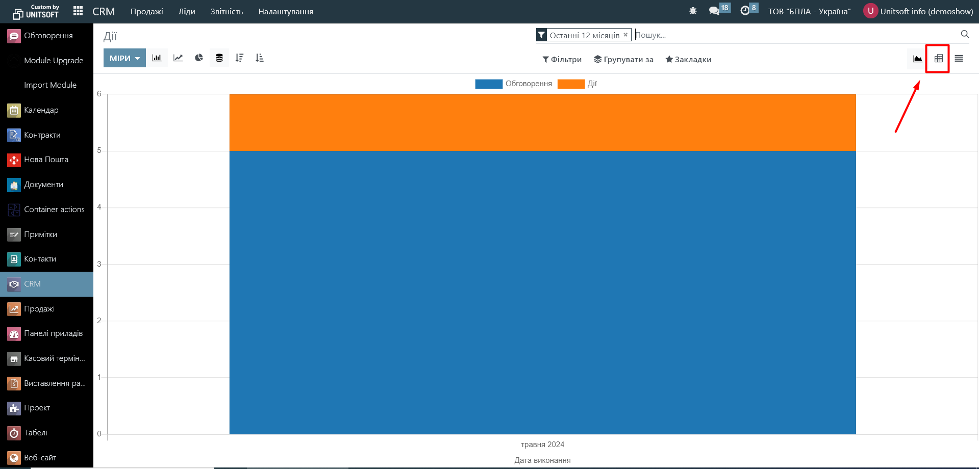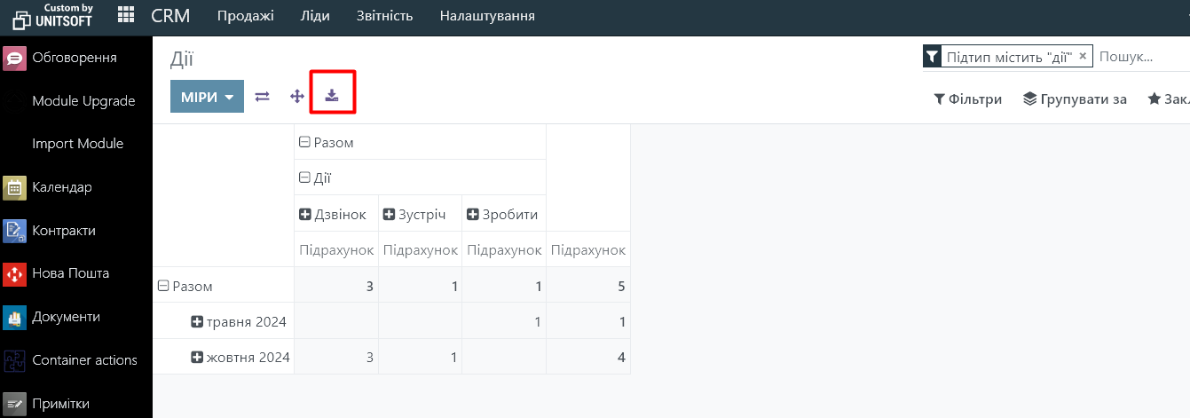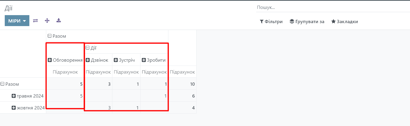 В звіті Ви побачите інформацію про виконанні дії ( тип «Дії) та кількість відправлених менеджером повідомлень чи листів через Odoo CRM (тип «Обговорення»):