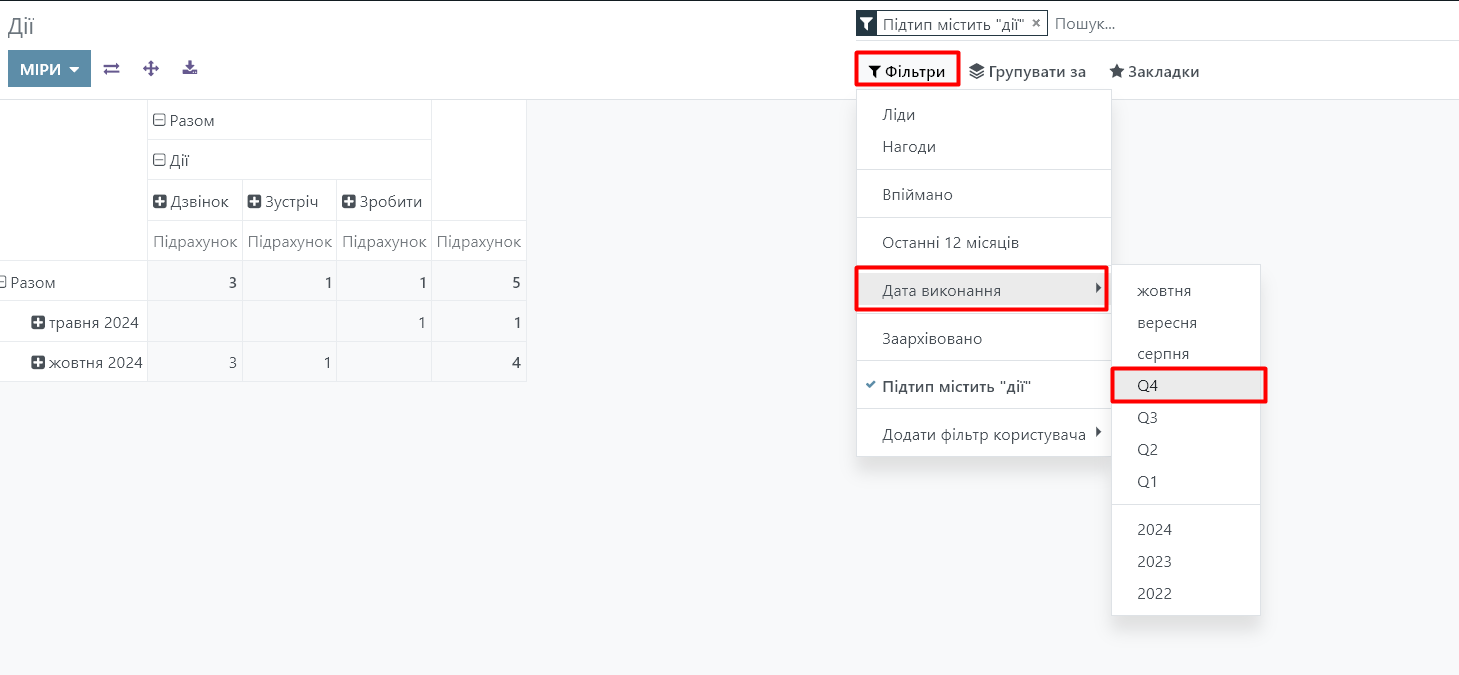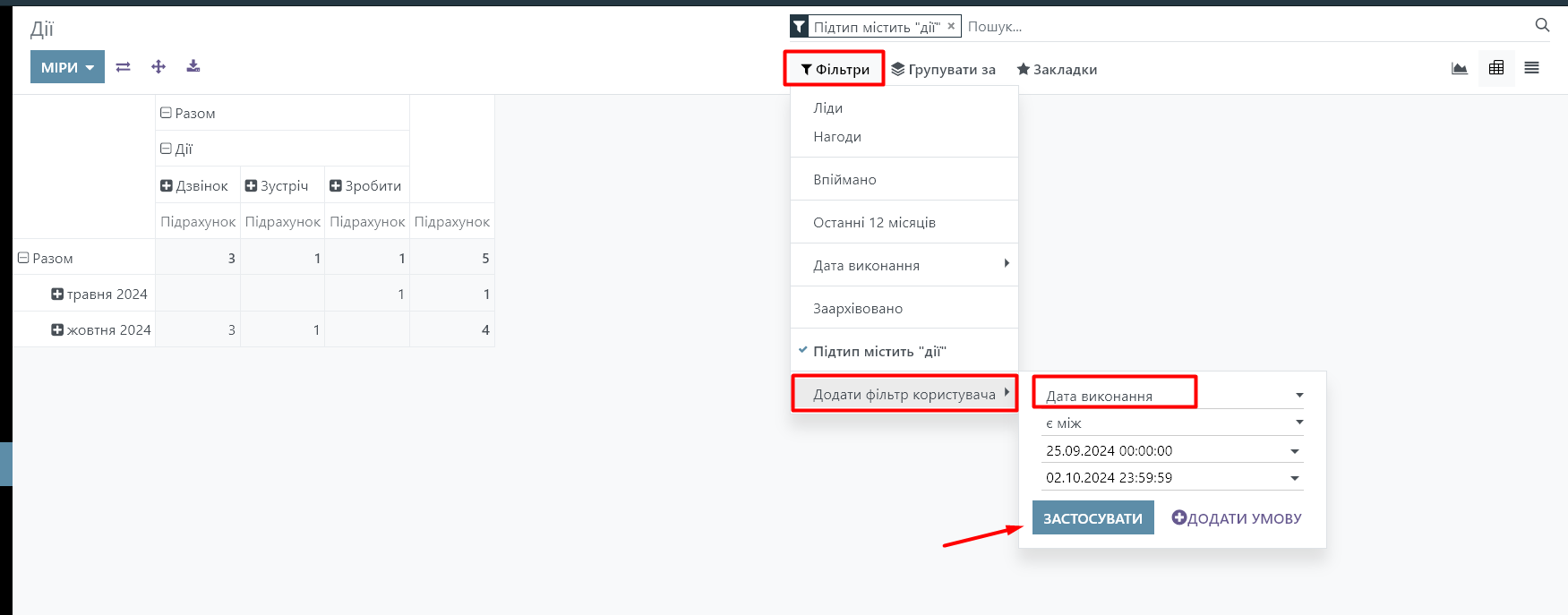 Спершу додайте фільтри. В нашому випадку – за датою виконання:
