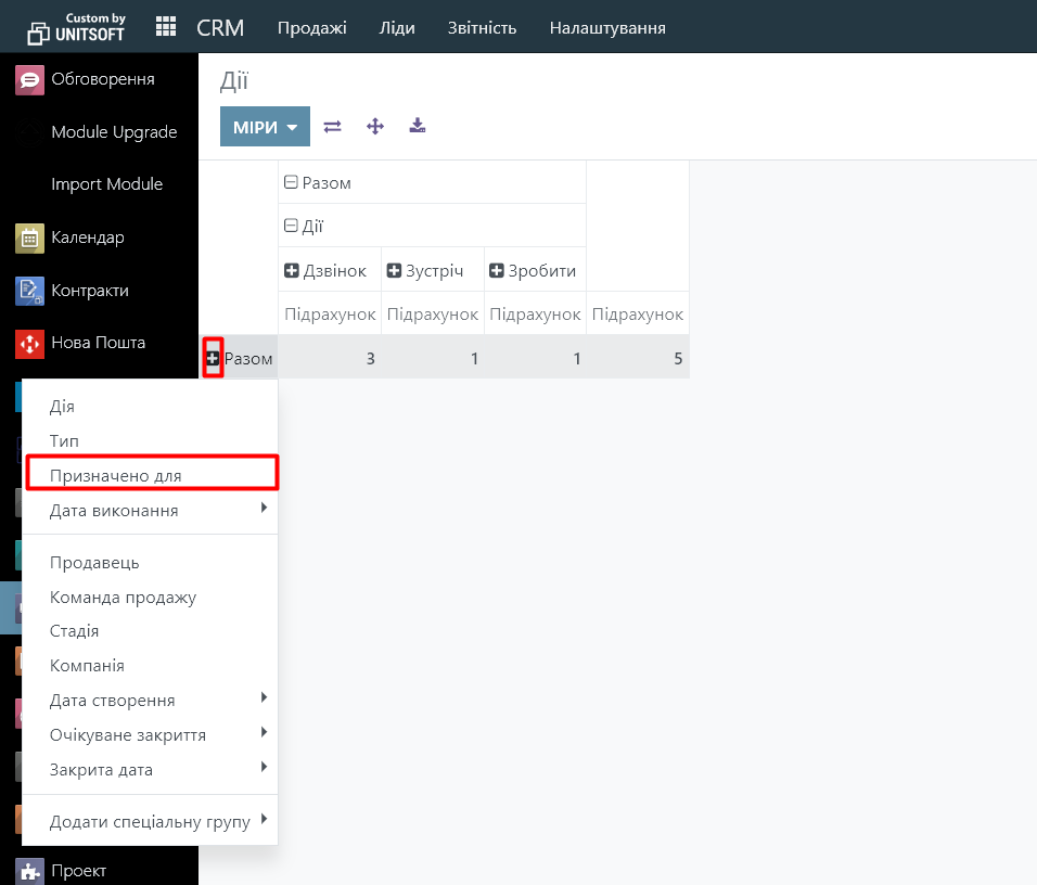Додаємо групування по менеджерах, які виконали завдання. Для цього натискаємо піктограму «плюс» біля «Разом» і натискаємо «Призначено для»: