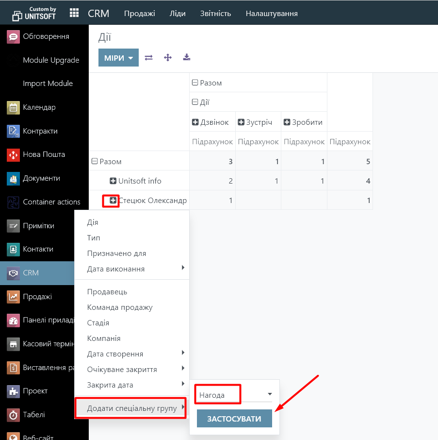 Можемо додати ще групування по нагодах, в розрізі яких виконувалися завдання. Для цього натискаємо на плюсик біля менеджера – «Додати спеціальну групу» - «Нагода»: