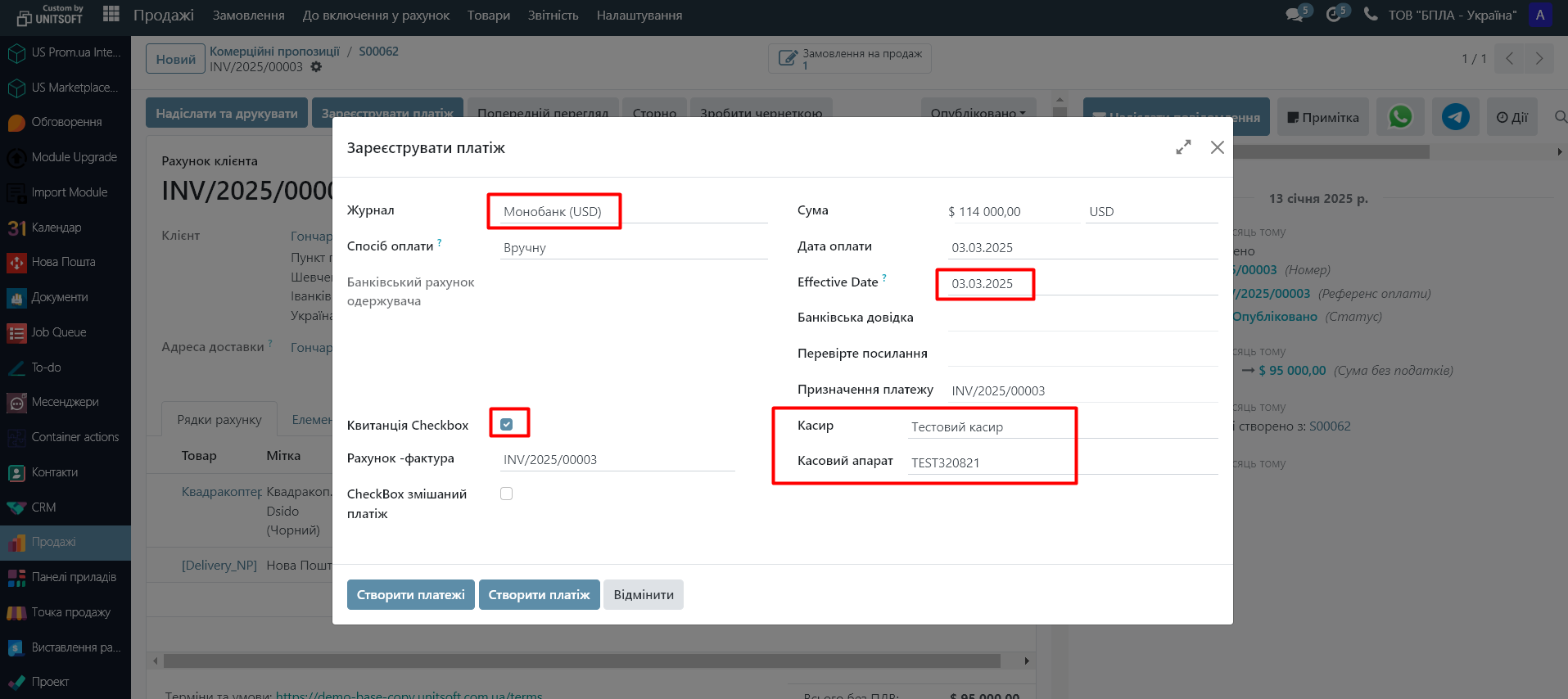 3. Вкажіть журнал оплати (банківський рахунок, касу). Якщо вказаного журналу прив’язаний Чекбокс, то у Вас з’являться налаштування Чекбоксу. Проставте відмітку «Квитанція Чекбокс» та вкажіть касовий апарат: