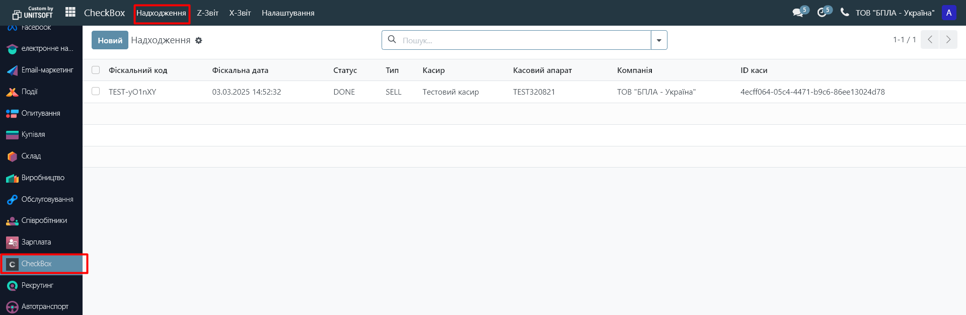 5. Створені фіскальні чеки можна буде побачити в модулі «Чекбокс» в розділі «Надходження»: