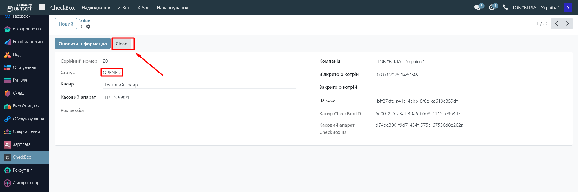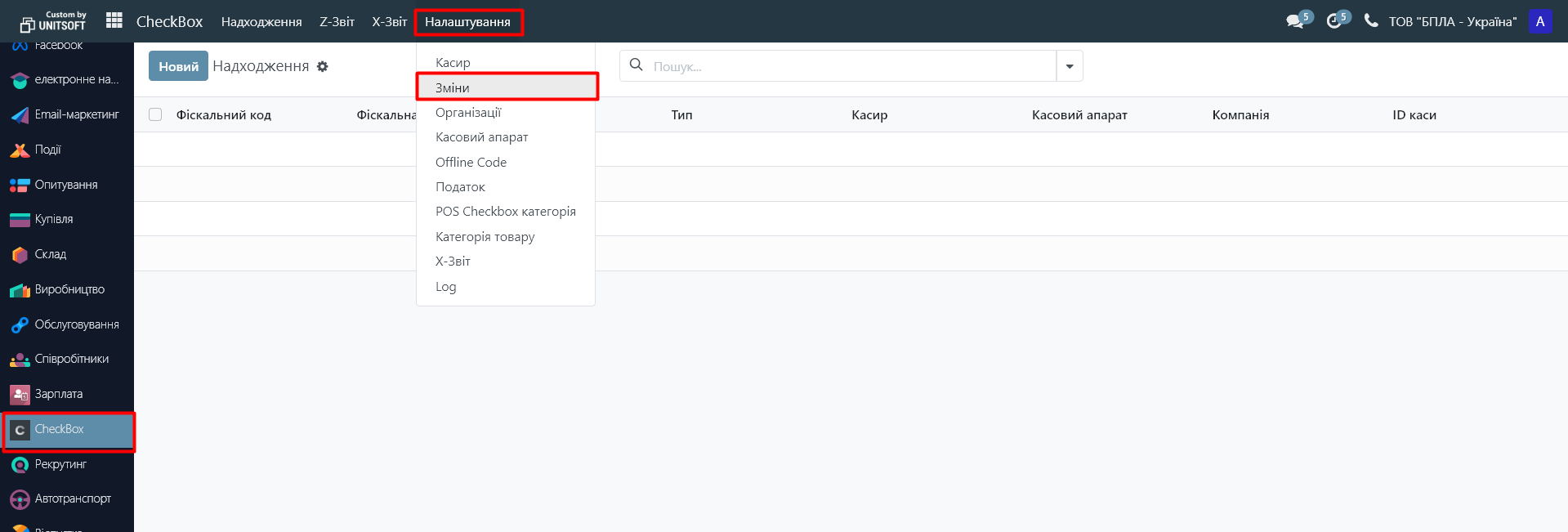 6. Вкінці робочого дня через меню «Чекбокс» - «Налашування» - «Зміни» можете перейти в касову зміну, щоб закрити її: