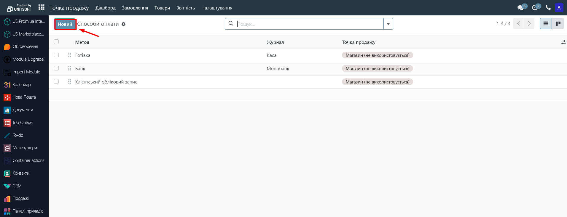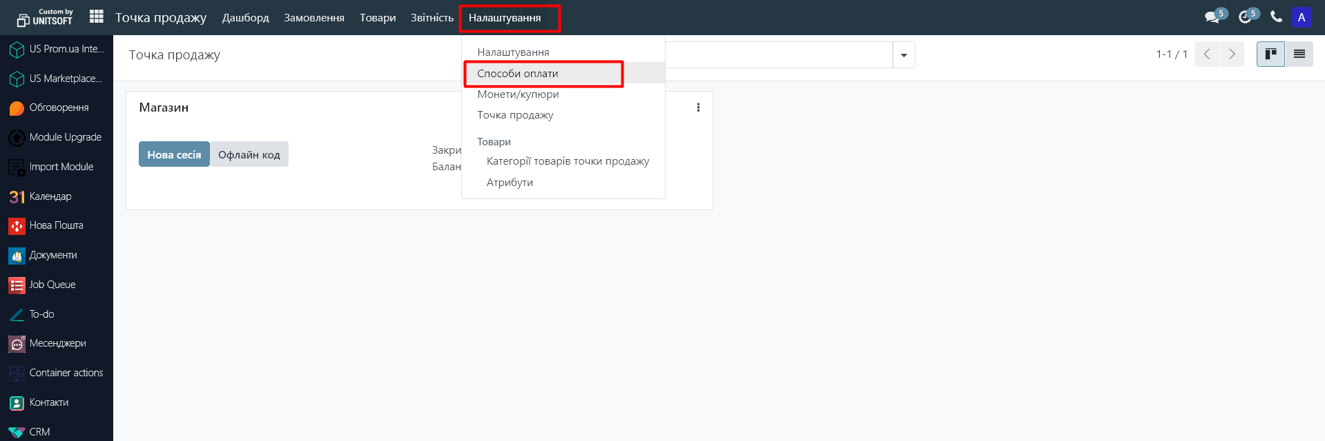 - Перейдіть у головне меню модуля «Точка продажу» - «Налаштування» - «Способи оплати».