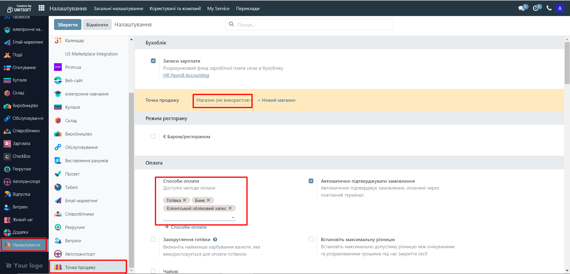 8. Перейдіть в модуль «Налаштування». В розділі «Точка продажу» вкажіть додані способи оплати: