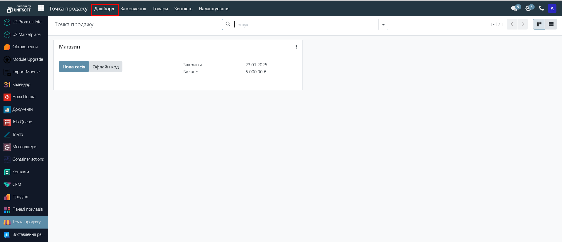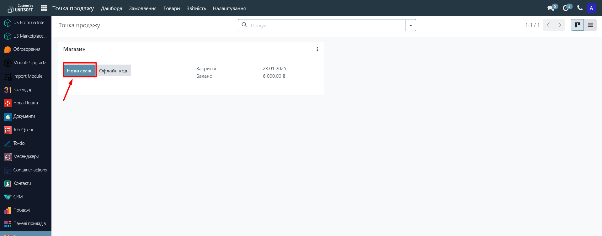- Перейдіть у модуль «Точка продажу». В потрібній точці продажу натисніть «Нова сесія»: