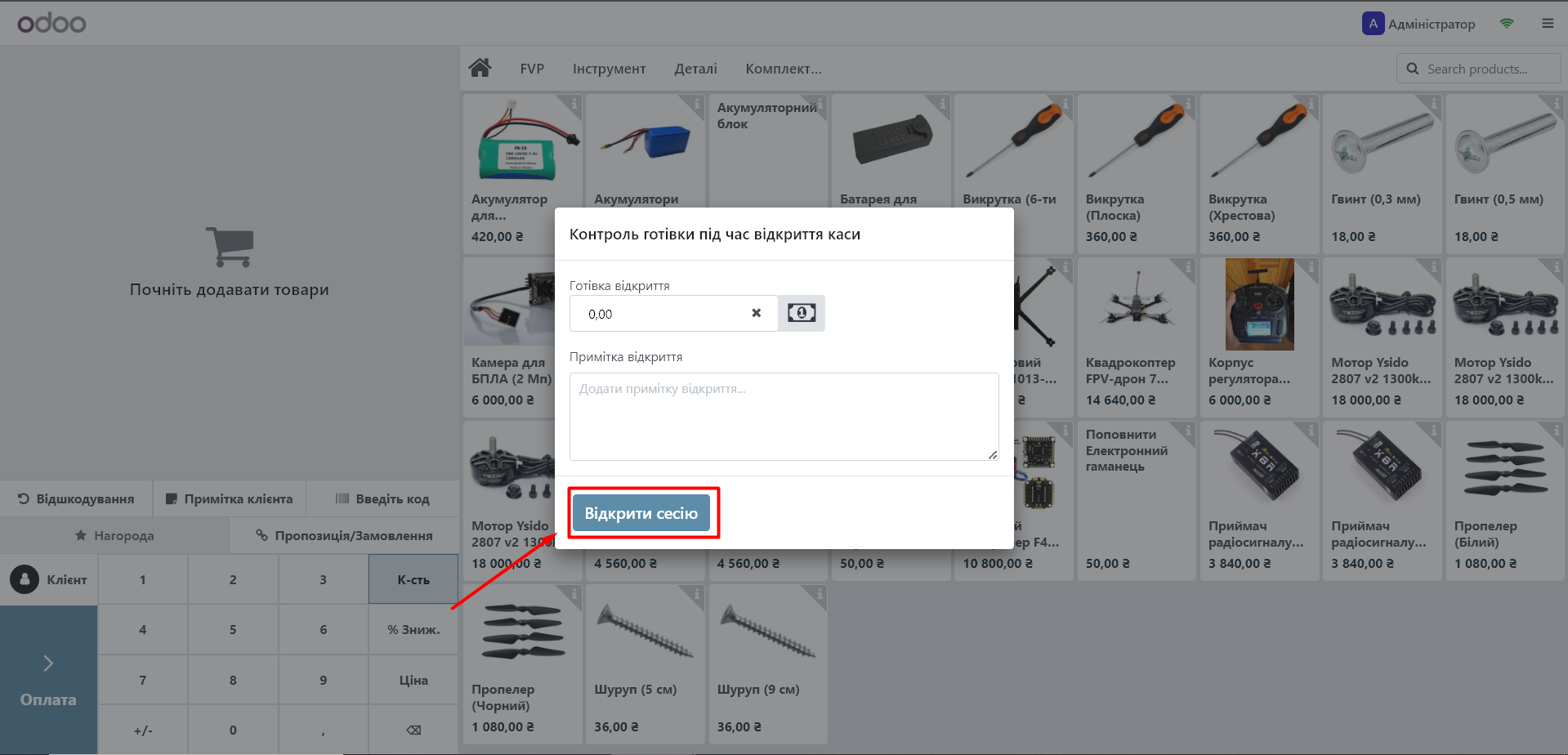 2. Вкажіть суму готівки відкриття і натисніть «Відкрити сесію»: