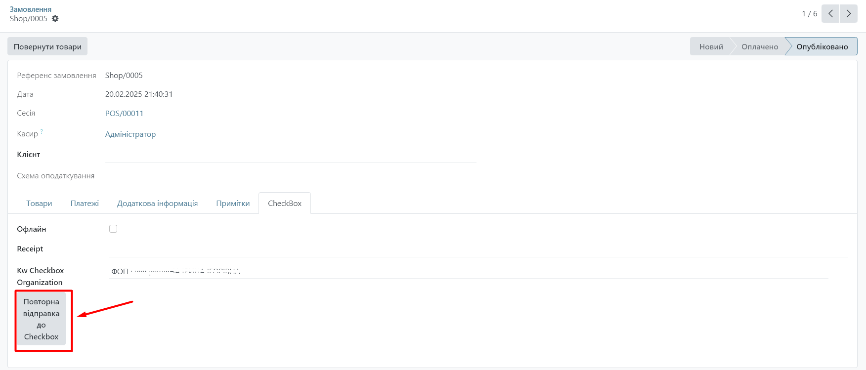 Якщо платіж пройшов в "Odoo", але по якійсь причині не пройшов через "Checkbox", то в замовлені на вкладці "Checkbox" з'являється кнопка "Повторна відправка в Checkbox". Натиснувши цю кнопку, платіж повторно надсилається в "Checkbox" і в полі "Recaipt" з'являється номер чеку, а кнопка зникає.