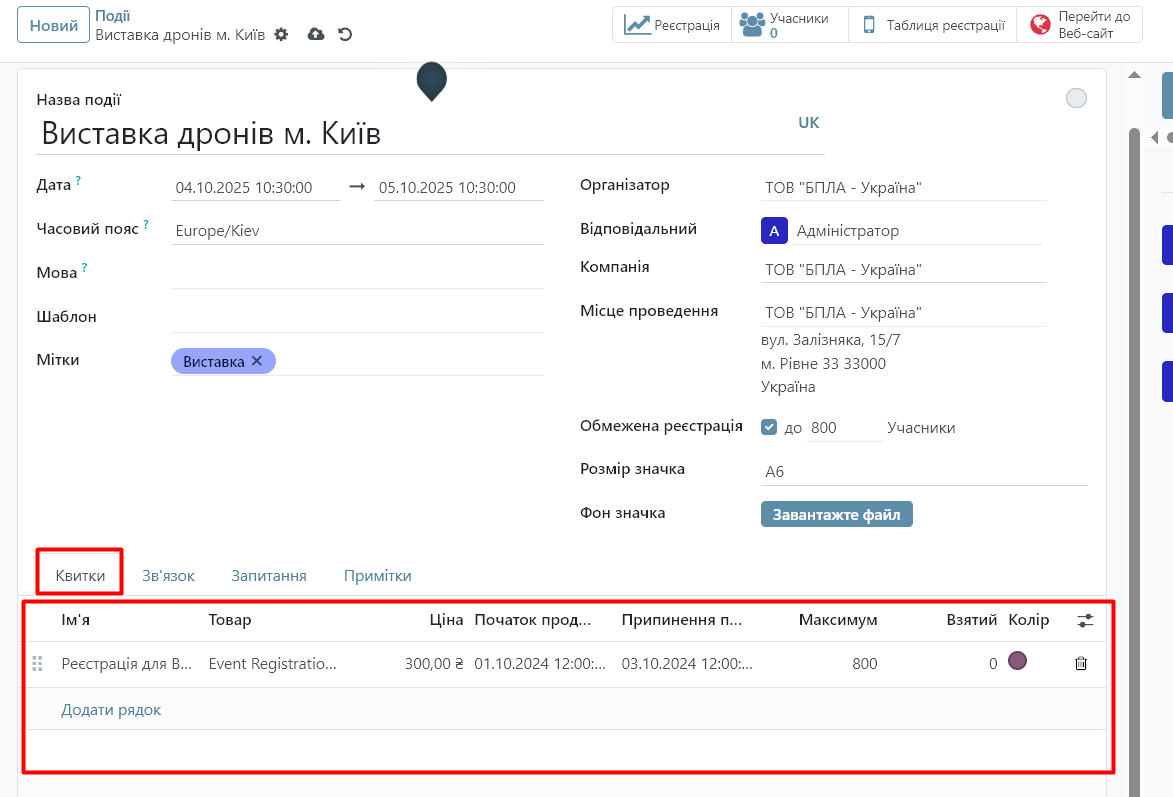 - Квитки — створити типи квитків (безкоштовні чи платні), їх ціну, кількість та період продажу.
