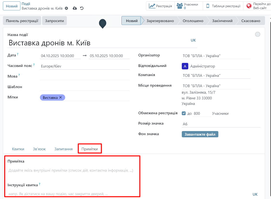 - Примітки – додати внутрішню інформація користувачам системи або додати інструкцію до квитка (як дістатися на подію, час закриття дверей і т.д.)