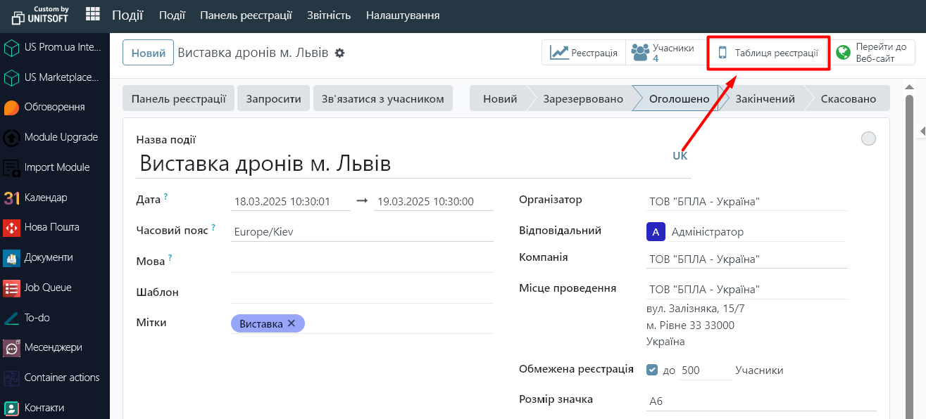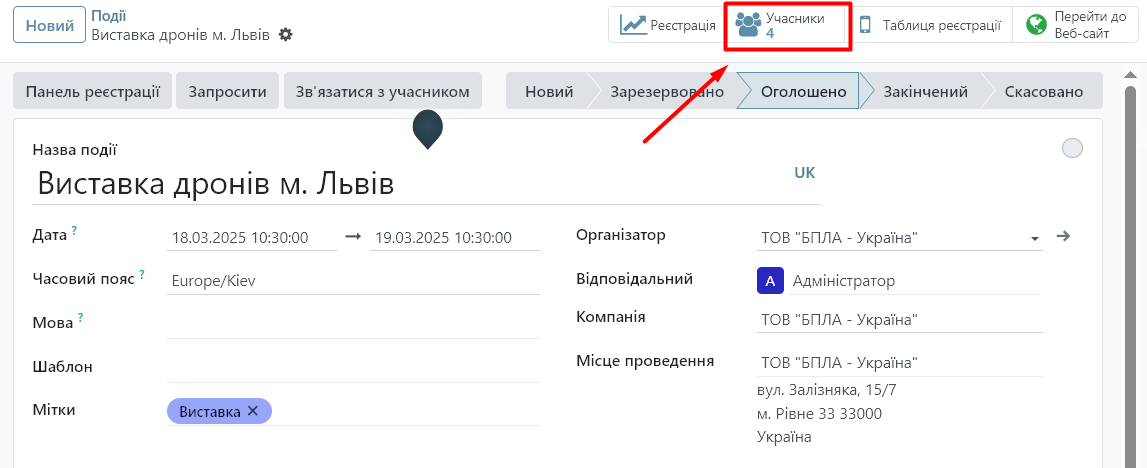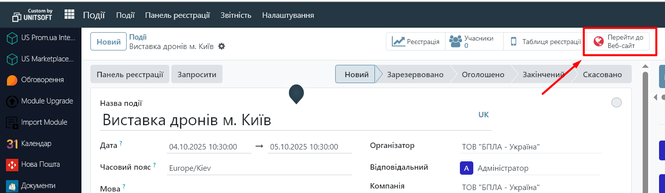 Після створення події натисніть «Опублікувати» щоб вона стала доступною на сайті (якщо використовується модуль сайту). Також перед публікацією сторінки перевірте її вигляд, при потребі відредагуйте відображену інформацію.