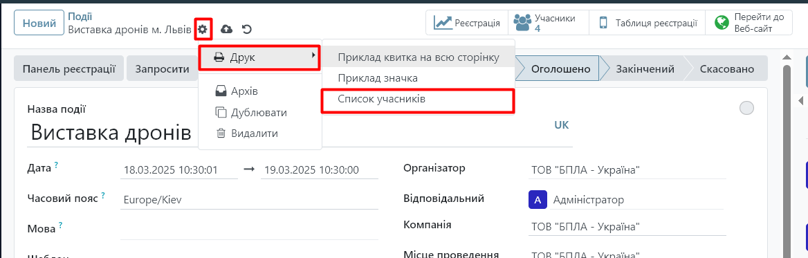 4. При необхідності, список учасників також можна роздрукувати через кнопку «Дія» в картці події: