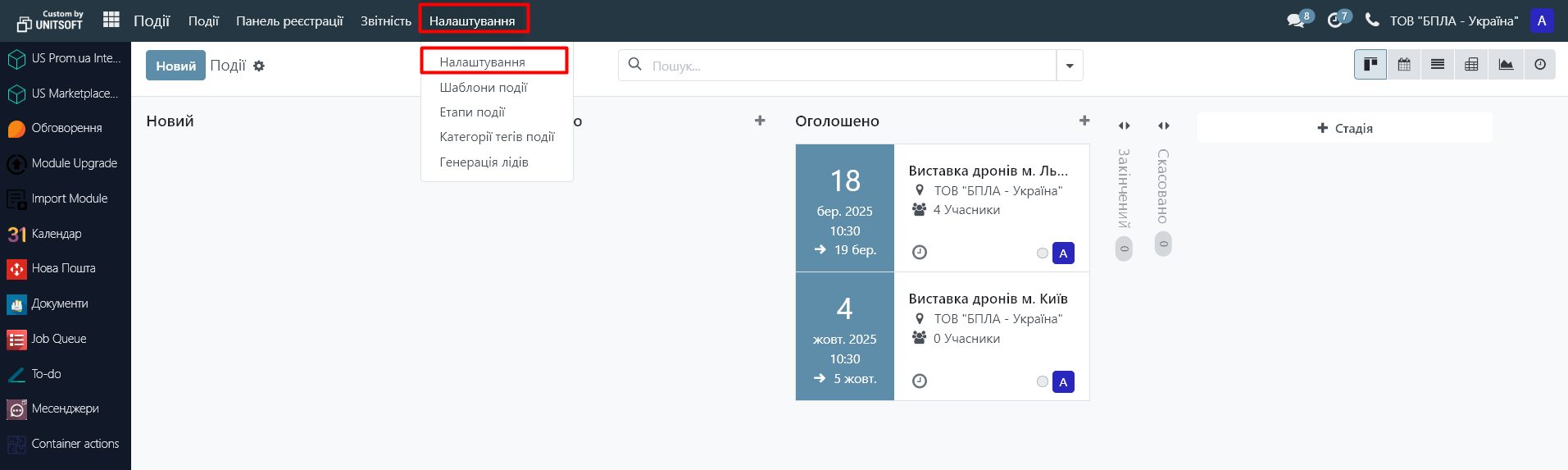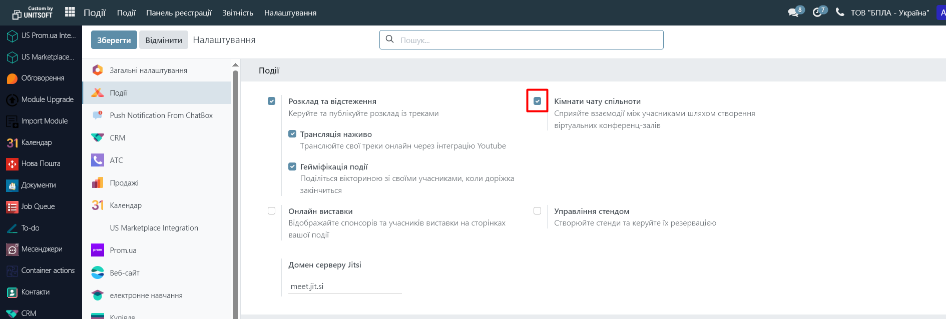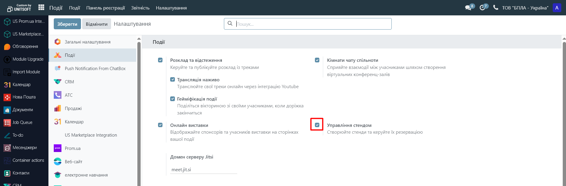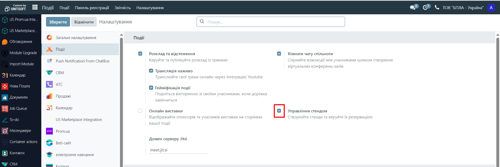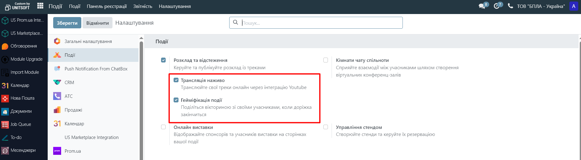 В налаштуваннях модуля «Події» ви можете включити ще додатковий функціонал модуля «Події»: