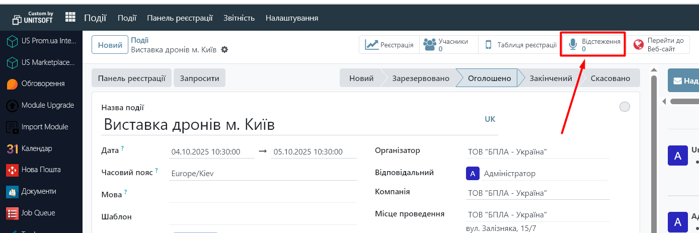 Для цього в картці події перейдіть в меню «Відстеження»: