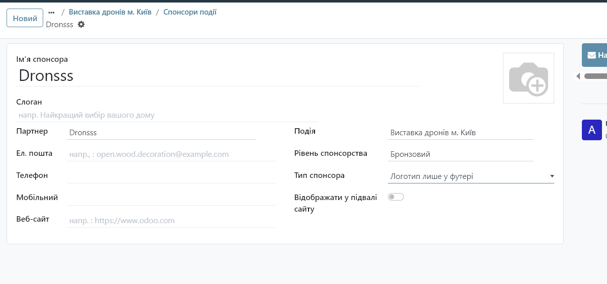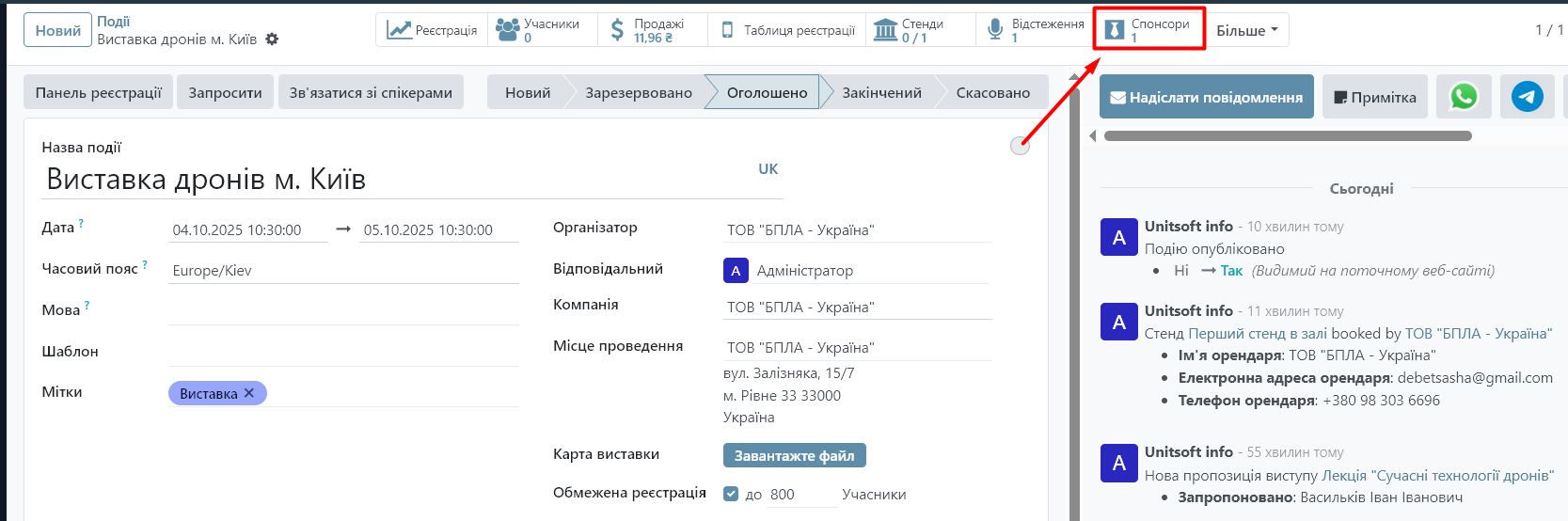 «Онлайн виставки» - налаштування, яке дозволяє вести облік спонсорів події (вручну, або створювати їх автоматично в момент купівлі оренди стенду). Ви можете відстежувати рівень спонсорства, налаштувати відображення спонсорів або зробити їх учасником події.