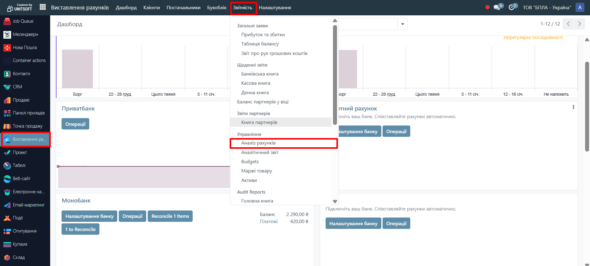 - Відкрийте розділ «Звітність» - «Аналіз рахунків»