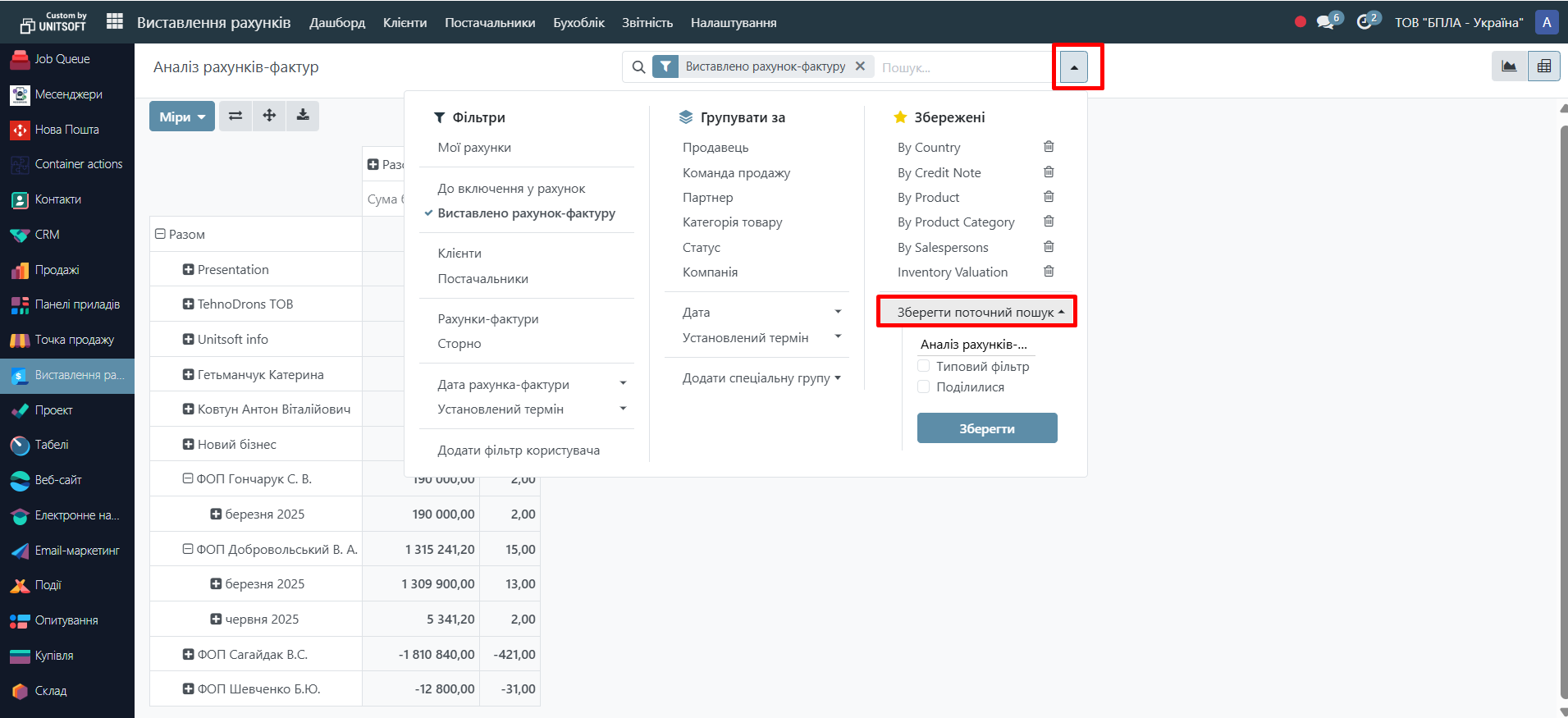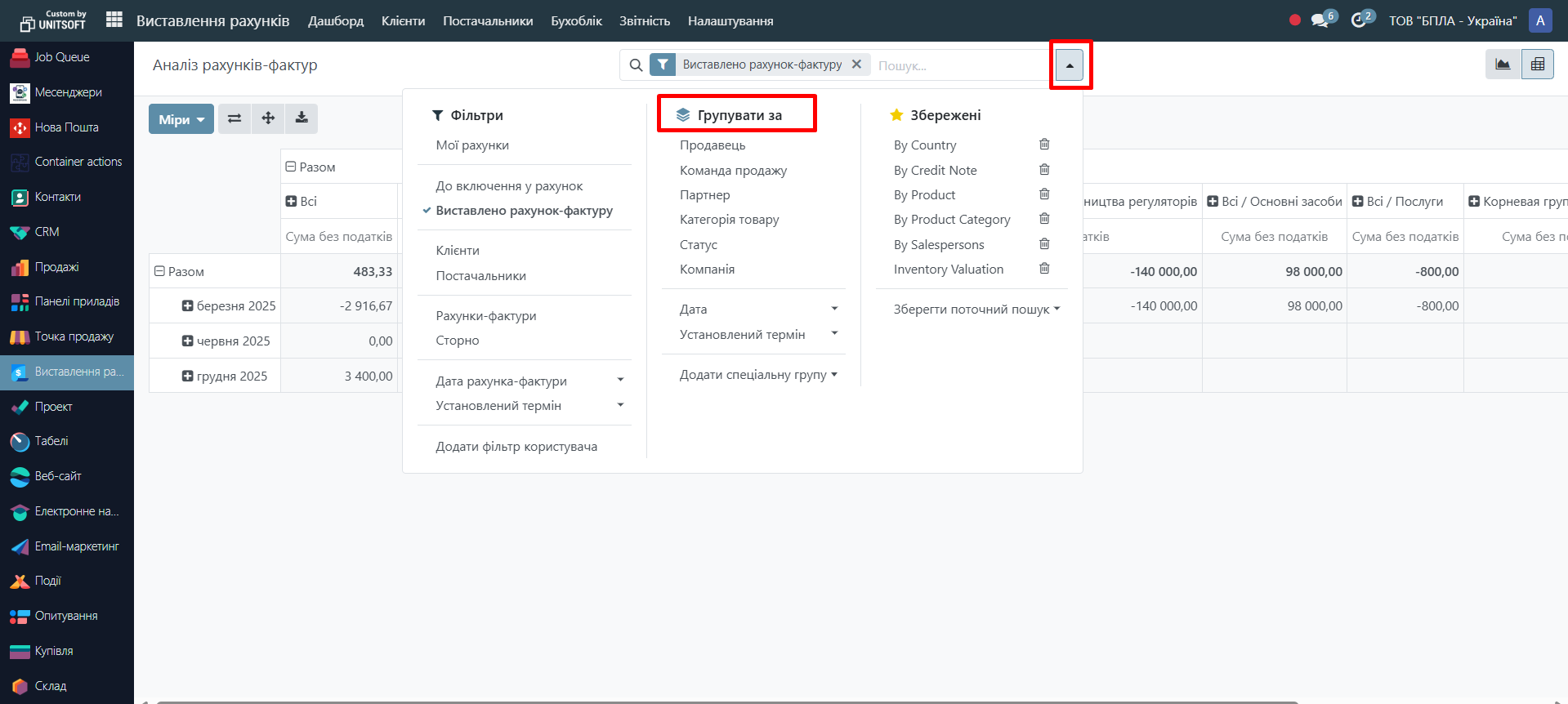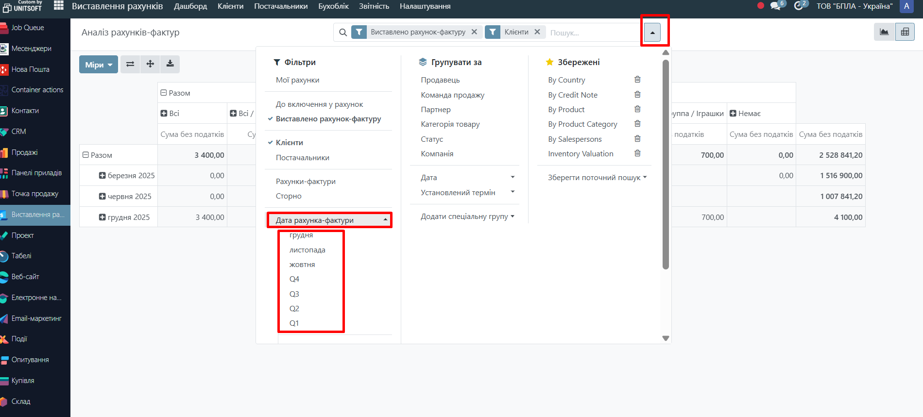 Найчастіше використовується фільтр за датою рахунку або датою документа.