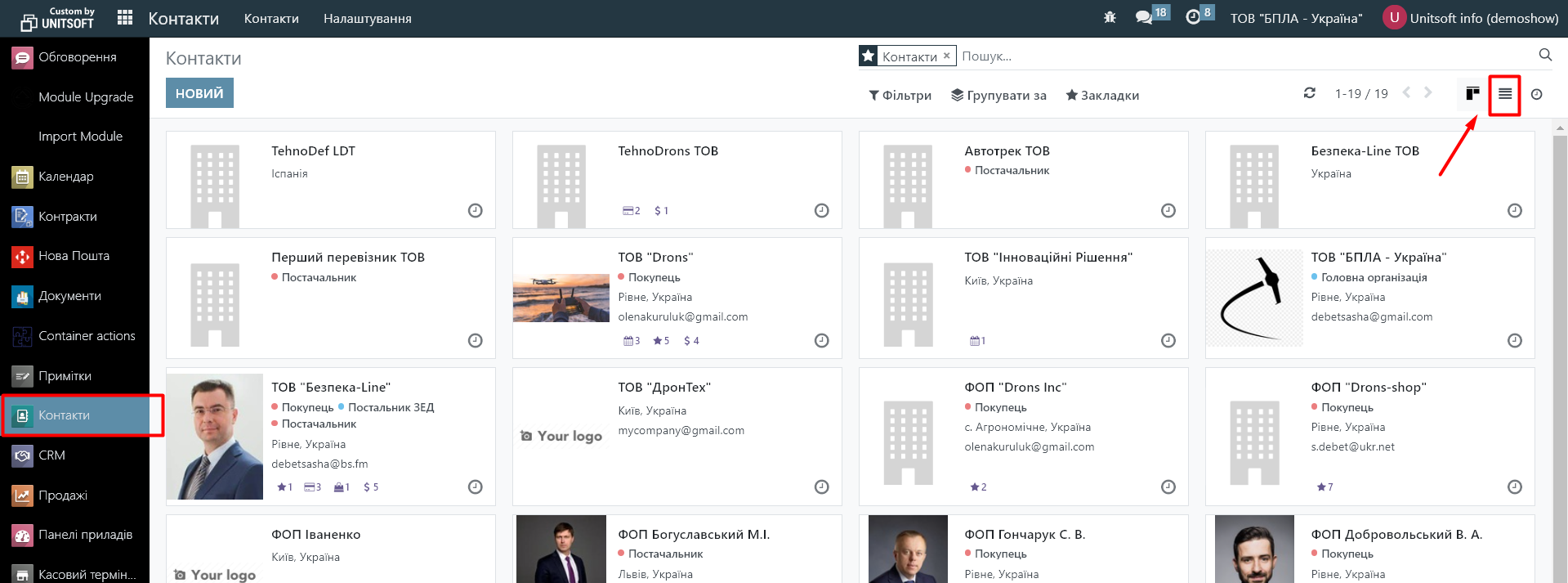 1. В модулі «Контакти» перейдіть на режим «Список»: