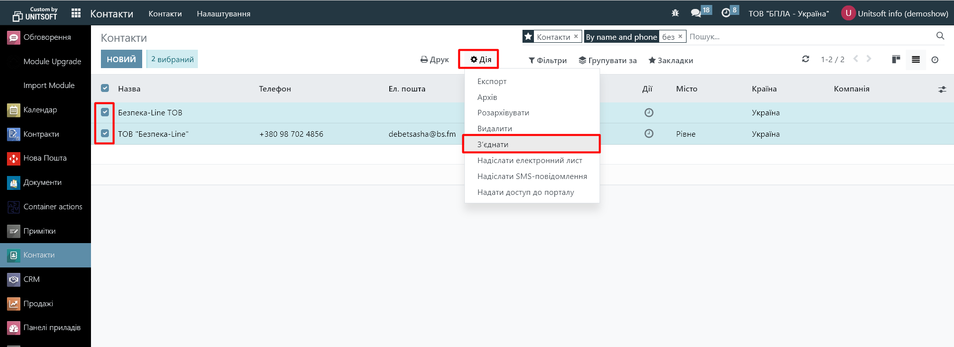 2. Виділіть контакти, які потрібно злити (щонайменше два). Для цього поставте галочку біля кожного з них у списку. Натисніть на кнопку «Дія» - «З’єднати»: