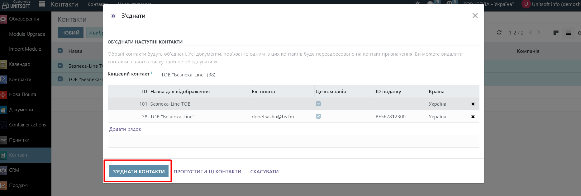 Часом у системі може з’явитися кілька контактів або партнерів, які фактично представляють одну і ту ж компанію чи особу. Для підтримки чистоти даних в Odoo можна об'єднувати дублікати контактів. Система дозволяє злиття, при цьому зберігаються всі пов'язані операції та записи.