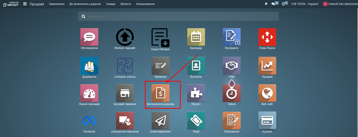 Спершу створюємо сам платіж. Переходимо в модуль «Виставлення рахунків»:
