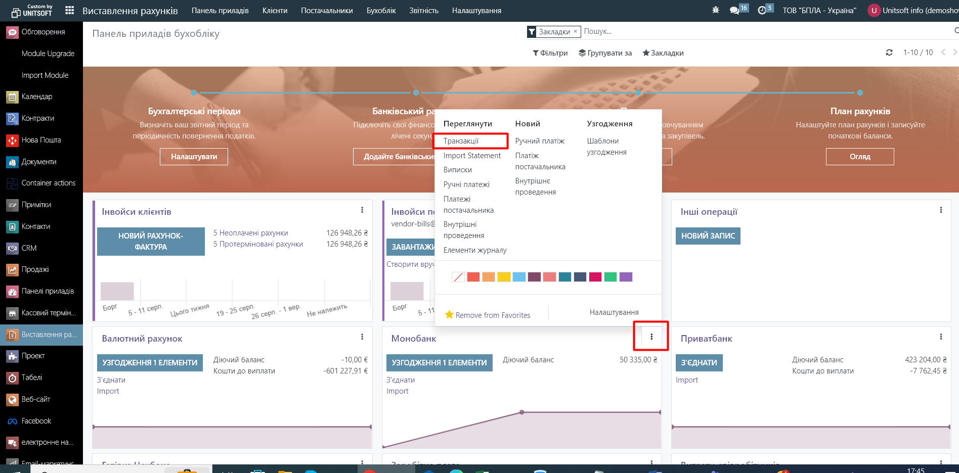 Для створення нового платежу натискаємо на три крапки в правому верхньому куті журналу і обираємо «Транзакції»: