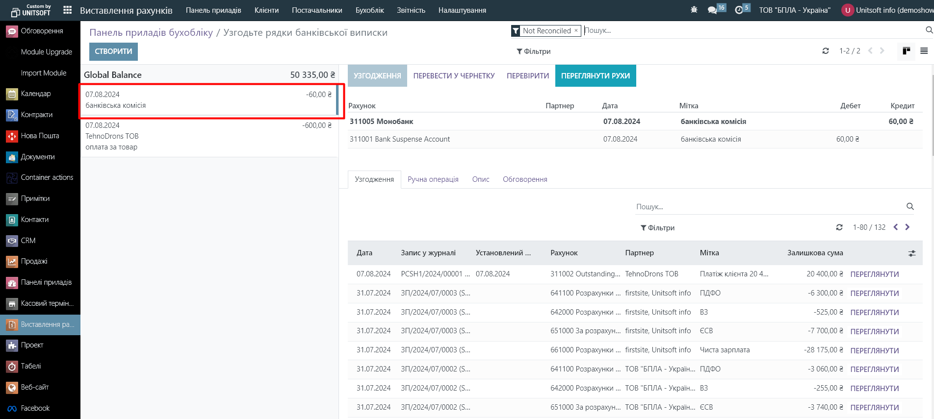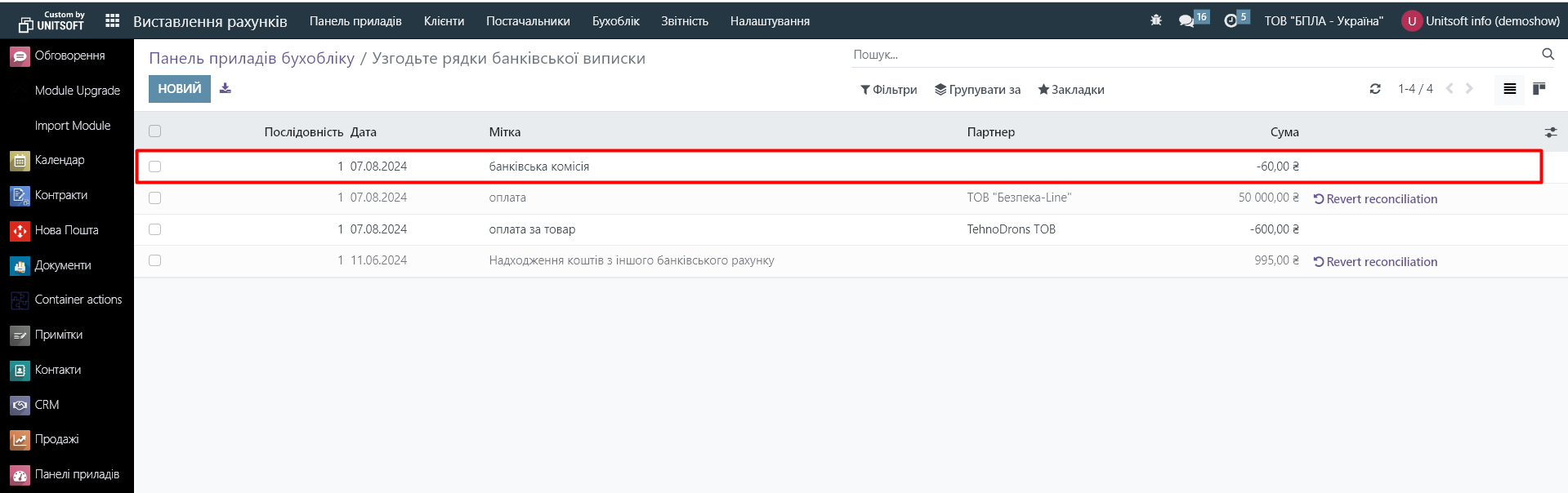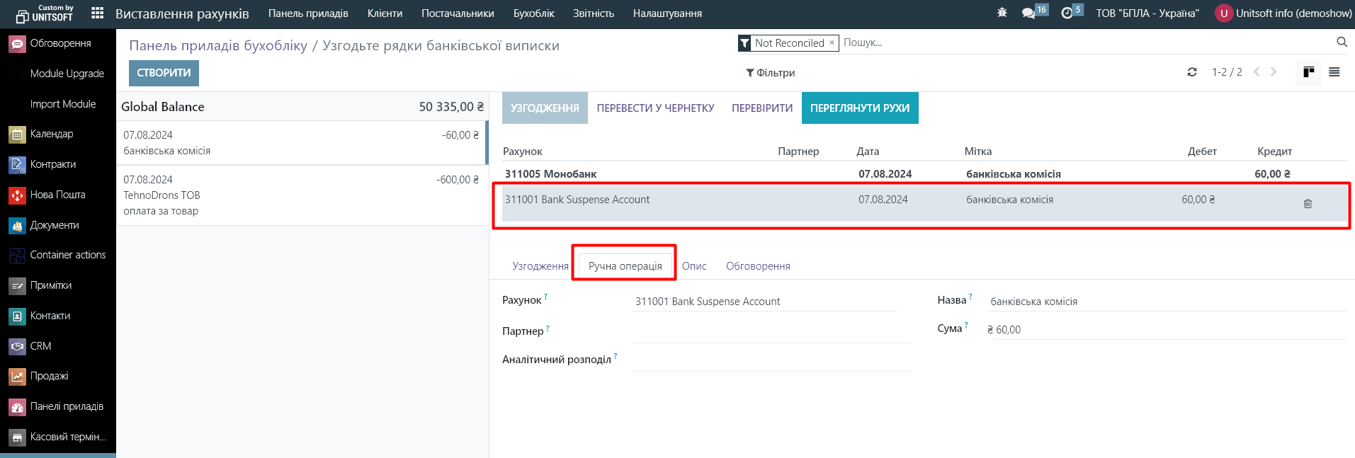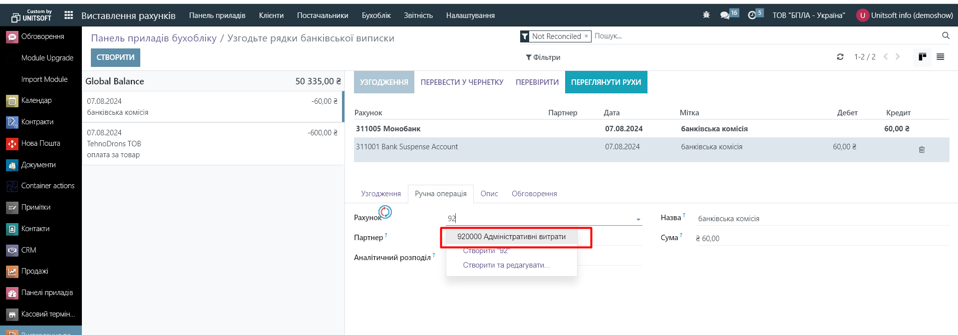 В новому вікні створюємо запис про оплату банківської комісії. Партнера можна не вказувати. Сума з мінусом, оскільки це списання з банківського рахунку:
